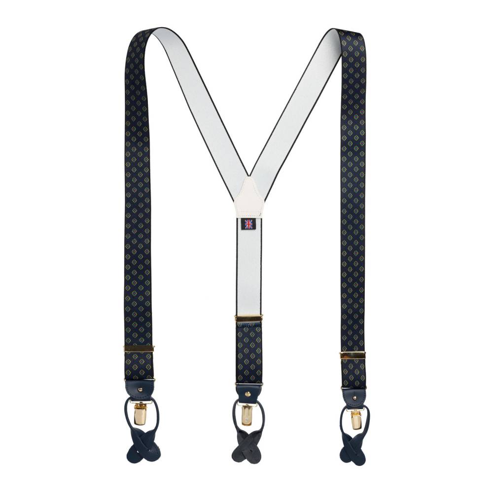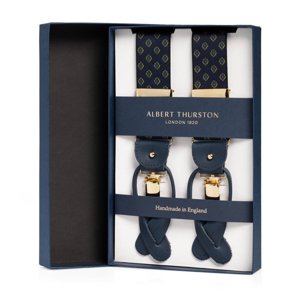 Классические Y-образные подтяжки легендарного английского бренда Albert Thurston. Лента выполнена из хлопка в сочетании с эластаном, а петли и спинка – из прочной натуральной кожи. Подтяжки можно крепить при помощи петель, если брюки имеют пуговицы, либо при помощи металлических зажимов. В комплект входит набор из 6 пуговиц.