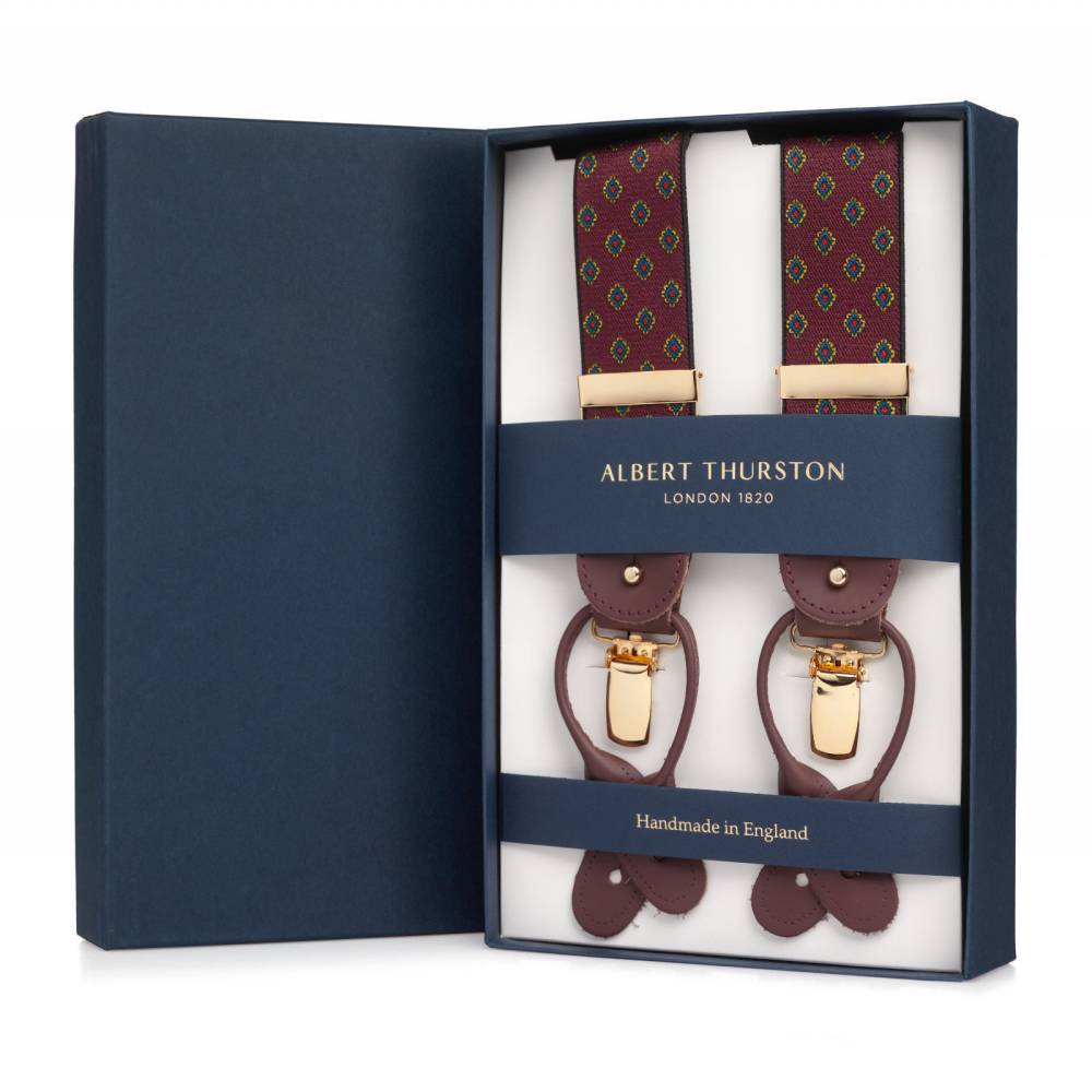 Классические Y-образные подтяжки легендарного английского бренда Albert Thurston. Лента выполнена из эластичного текстиля, а петли и спинка – из прочной натуральной кожи. Подтяжки можно крепить при помощи петель, если брюки имеют пуговицы, либо при помощи металлических зажимов. В комплект входит набор из 6 пуговиц.