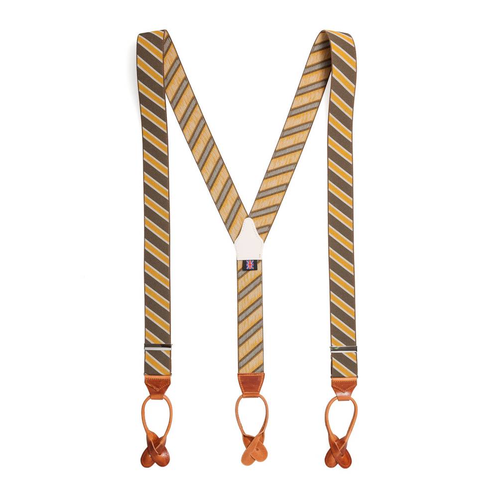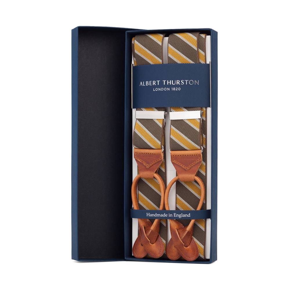 Классические Y-образные подтяжки легендарного английского бренда Albert Thurston. Лента выполнена из хлопка в сочетании с эластаном, а петли и спинка – из прочной натуральной кожи. Подтяжки крепятся к брюкам при помощи петель. В комплект входит набор из 6 пуговиц.