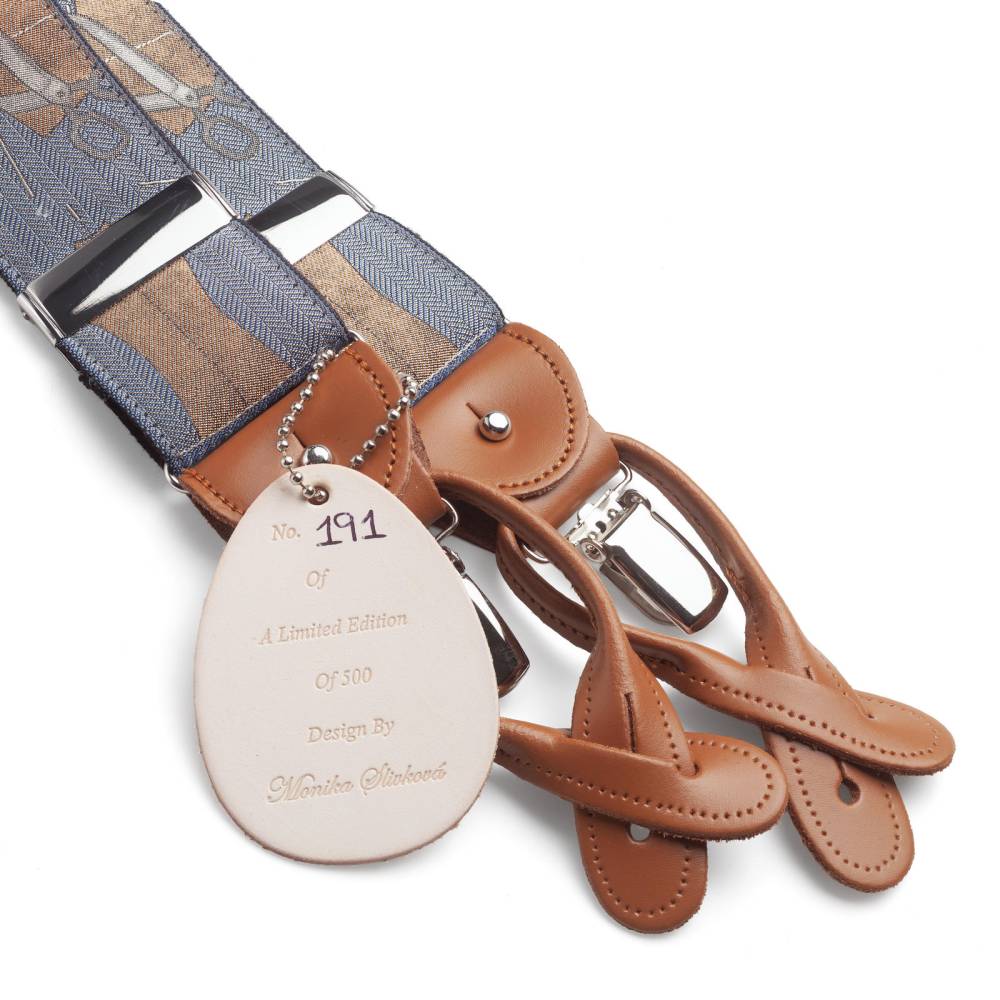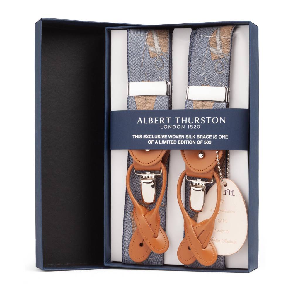 Классические Y-образные подтяжки английского бренда Albert Thurston из ограниченного выпуска. Лента выполнена из шёлка серо-голубых тонов, на котором вытканы изображения выкроек и портновских принадлежностей, а петли и спинка – из прочной натуральной кожи. Подтяжки можно крепить при помощи петель, если брюки имеют пуговицы, либо при помощи металлических зажимов. В комплект входит набор из 6 пуговиц. Шёлковые ленты с ткаными сюжетами были выпущены в ограниченном количестве. Подтяжек с каждым узором было изготовлено всего по 500 штук, и каждый экземпляр имеет индивидуальный номер.