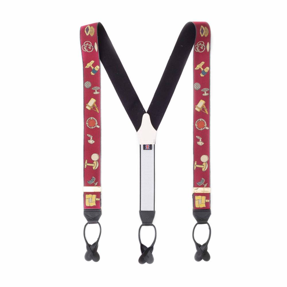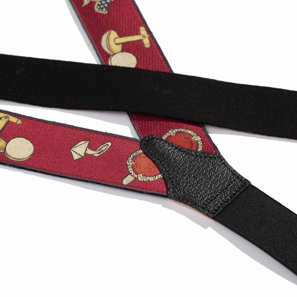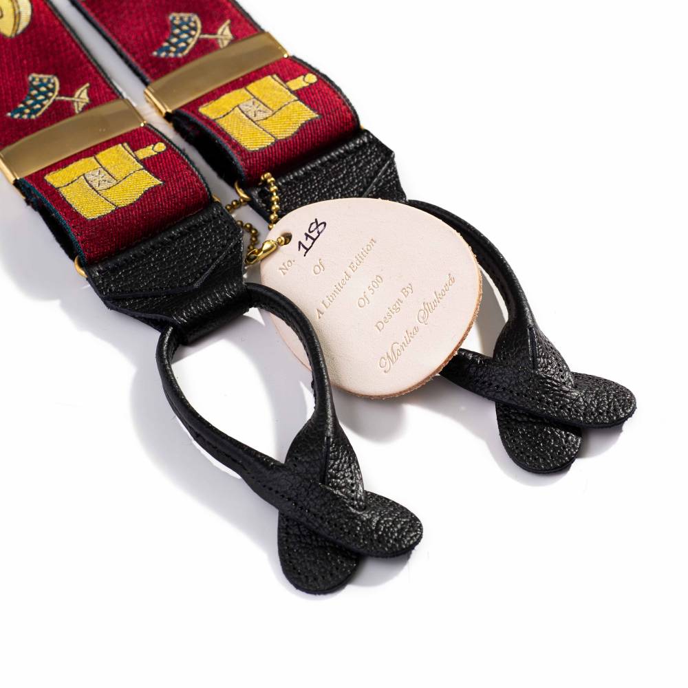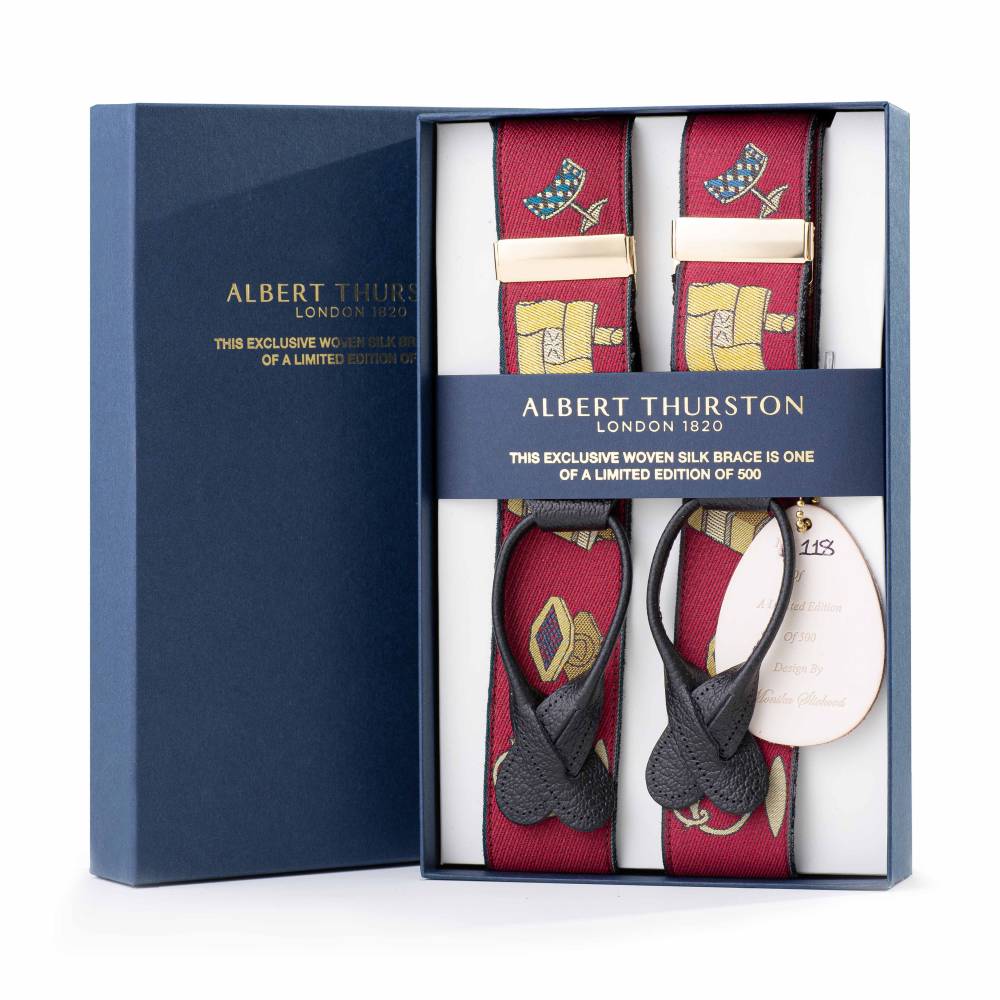 Лимитированные шелковые подтяжки ручной работы легендарного бренда Albert Thurston. Изготовлены вручную в традиционной Y-образной конструкции. Серия лимитирована: выпущено всего 500 экземпляров, каждый из которых имеет индивидуальный номер. Шёлковая жаккардовая лента, сотканная в графстве Девоншир, украшена узором в виде винтажных запонок разлиной формы и цвета. Обратная сторона отделана чистой шерстью Мелтон из Йоркшира для комфортного ношения. Подтяжки крепятся при помощи кожанных петель к пуговицам на брюках (набор 6 пуговиц в комплекте). В качестве альтернативы можно использовать металлические пуговицы.