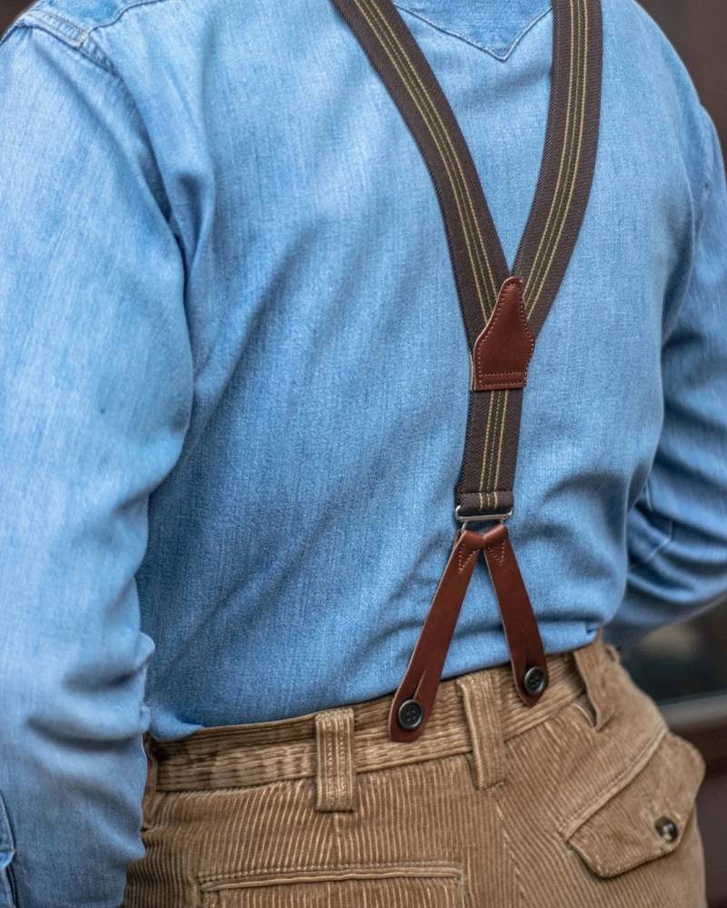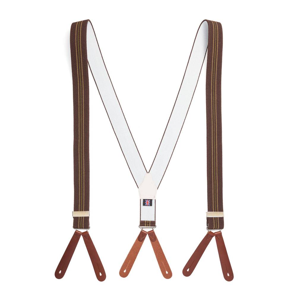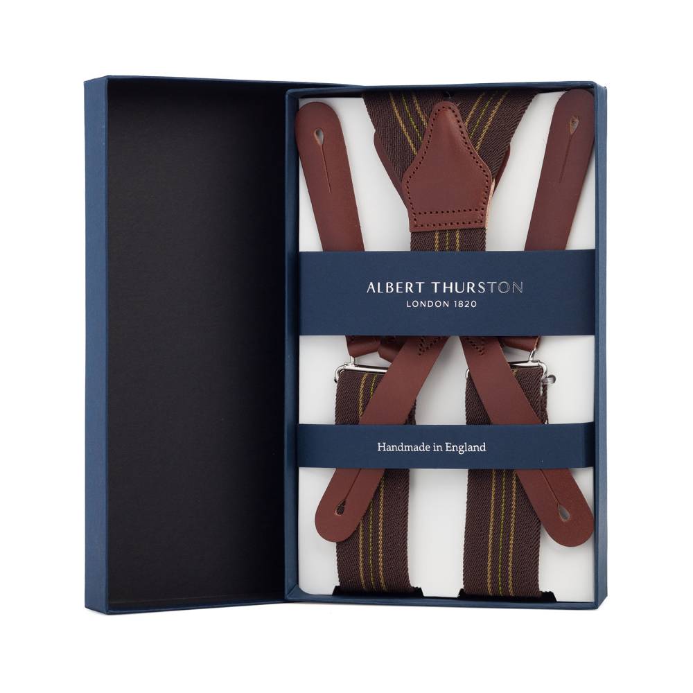 Классические Y-образные подтяжки английского бренда Albert Thurston, вдохновлённые форменными подтяжками британской армии времён Второй мировой войны. Лента выполнена из эластичного текстиля, а петли и спинка – из прочной натуральной кожи. Подтяжки крепятся к брюкам при помощи петель. В комплект входит набор из 6 пуговиц.