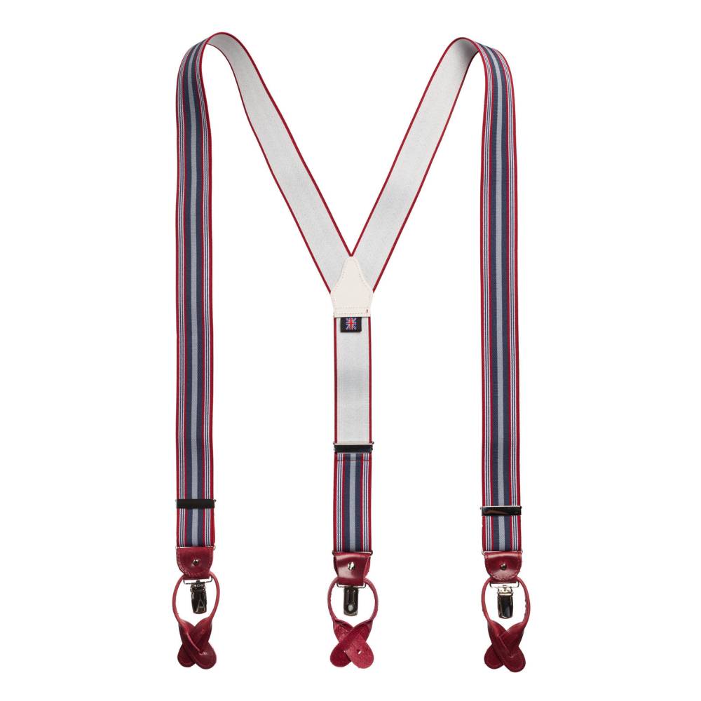 Классические Y-образные подтяжки легендарного английского бренда Albert Thurston. Лента выполнена из хлопка в сочетании с эластаном, а петли и спинка – из прочной натуральной кожи. Подтяжки можно крепить при помощи петель, если брюки имеют пуговицы, либо при помощи металлических зажимов. В комплект входит набор из 6 пуговиц.