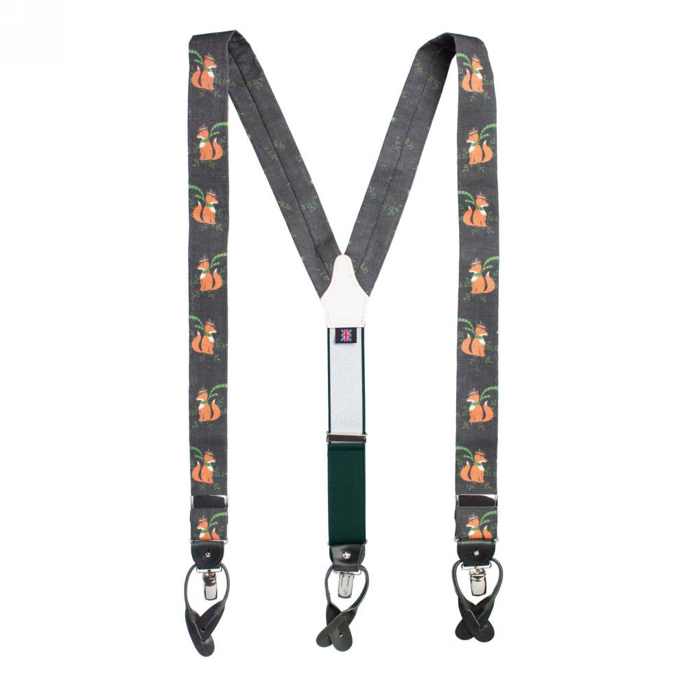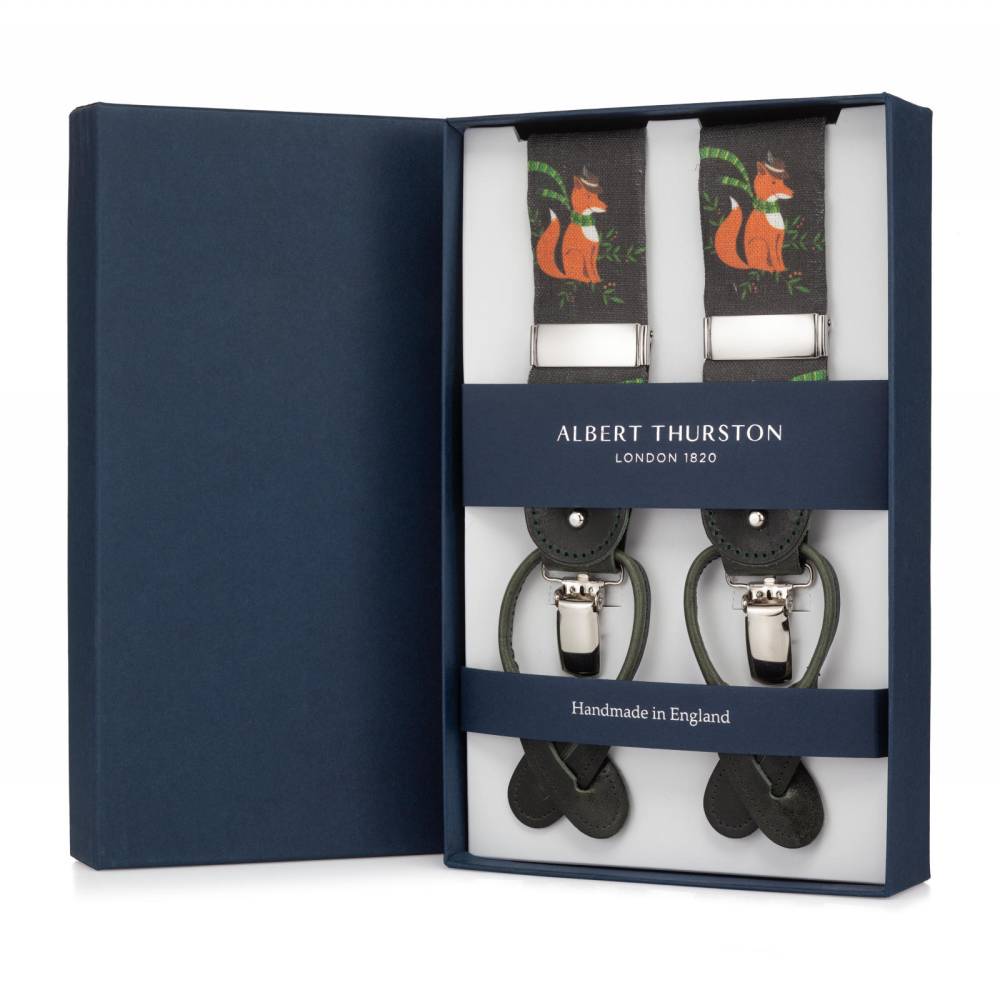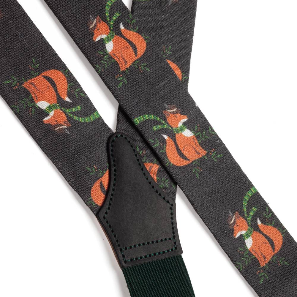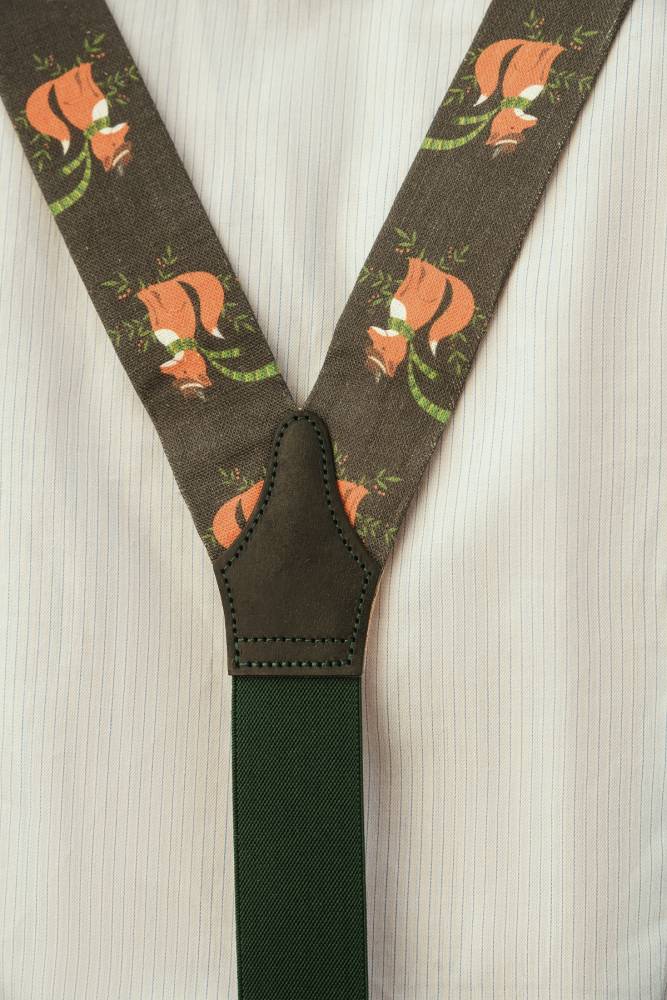Классические Y-образные подтяжки английского бренда Albert Thurston из тёмно-зелёной льняной ткани с изображениями лисы в шарфе и альпийской шляпе. Петли и спинка – из прочной натуральной кожи (задняя часть подтяжек изготовлена из эластичного материала, что добавляет комфорта при носке). Подтяжки крепятся при помощи кожаных петель. В комплект входит набор из 6 пуговиц.