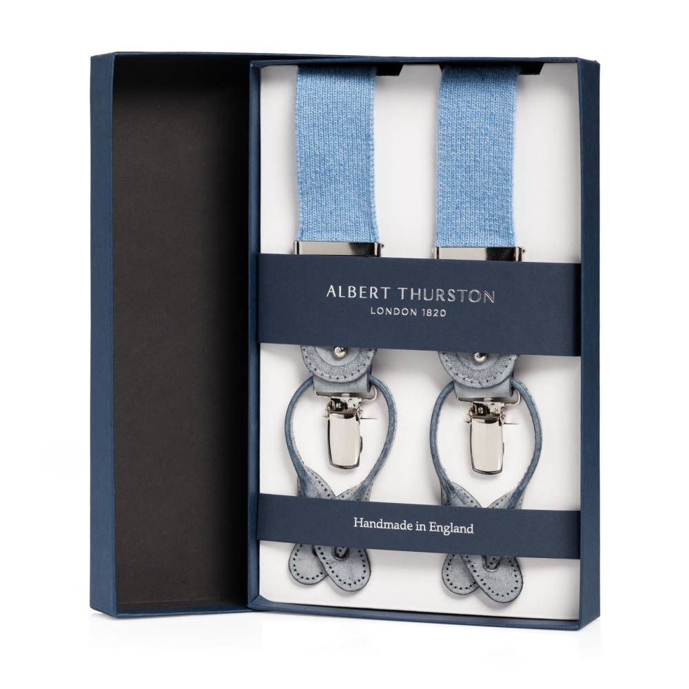 Классические Y-образные подтяжки легендарного английского бренда Albert Thurston. Лента выполнена из высококачественного кашемира в сочетании с эластаном, а петли и спинка – из прочной натуральной кожи. Шерсть для этого кашемира собирается на территориях Внутренней Монголии и в шотландском округе Перт-энд-Кинросс, а потом вручную плетется и стирается в шотландском городке Хоик. Подтяжки можно крепить при помощи петель, если брюки имеют пуговицы, либо при помощи металлических зажимов. В комплект входит набор из 6 пуговиц.