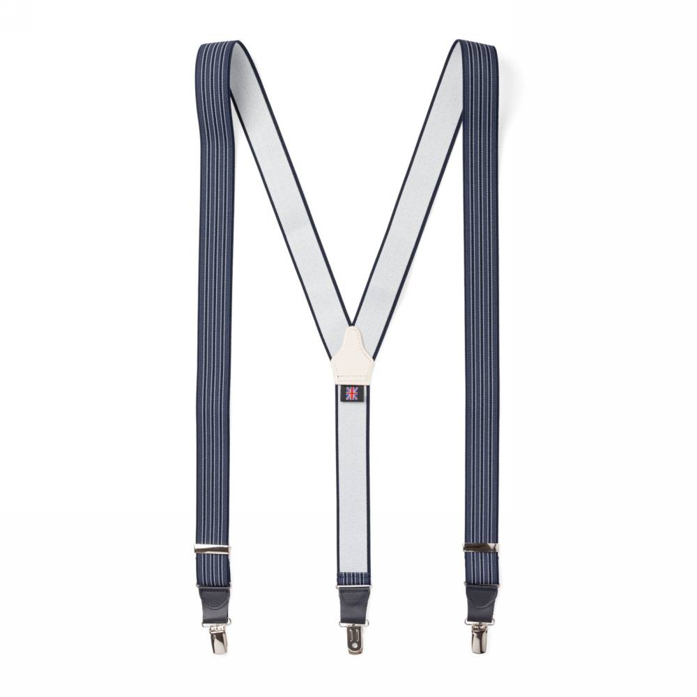 Классические тёмно-синие Y-образные подтяжки английского бренда Albert Thurston. Лента выполнена из эластичного текстиля с контрастными полосами, а укрепления и спинка – из прочной натуральной кожи. Подтяжки крепятся при помощи металлических зажимов.