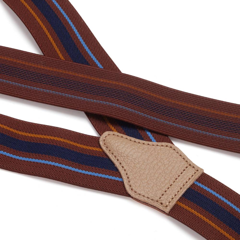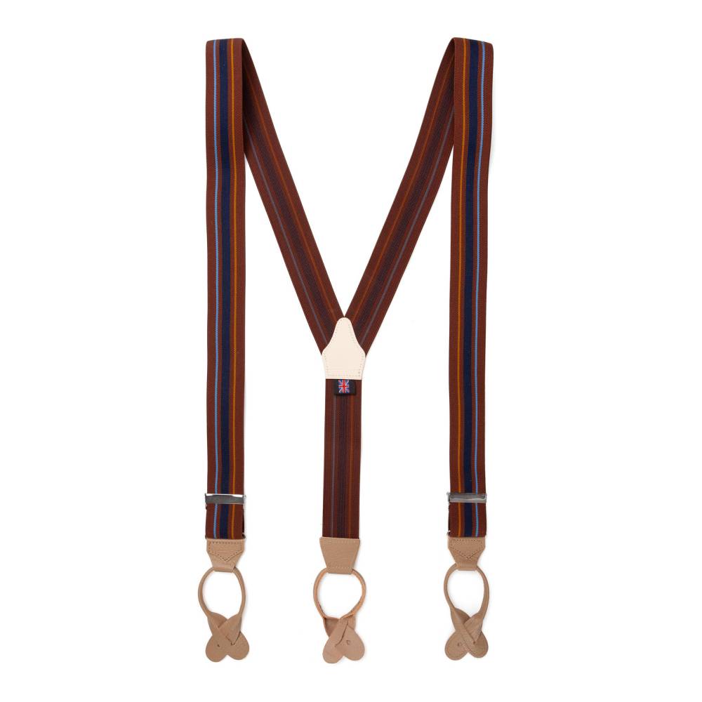 Классические подтяжки английского бренда Albert Thurston. Лента выполнена из эластичного текстиля в коричневых тонах, а петли и спинка – из прочной натуральной кожи кремового цвета. В комплект входит набор из 6 пуговиц. Традиционная Y-образная конструкция.