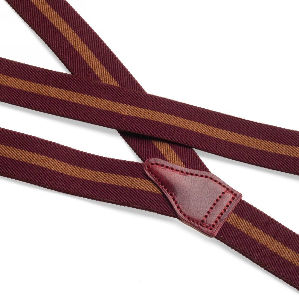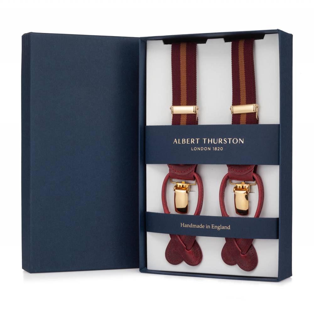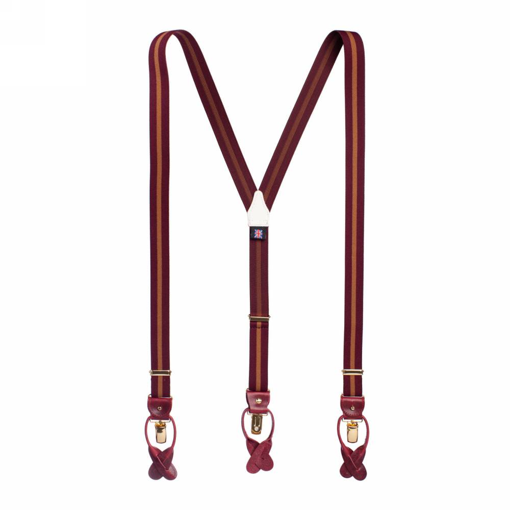 Неширокие Y-образные подтяжки английского бренда Albert Thurston бордового цвета с коричневой полосой по центру. Лента выполнена из эластичного текстиля, а петли и спинка – из прочной натуральной кожи. Подтяжки можно крепить при помощи петель, если брюки имеют пуговицы, либо при помощи металлических зажимов. В комплект входит набор из 6 пуговиц. Металлические элементы золотистого цвета. Такие узкие подтяжки будут превосходно сочетаться с классическими галстуками шириной 8 или 8,5 см и несильно отвлекать от него внимание. Также они могут быть более подходящим выбором для мужчин худощавого телосложения.