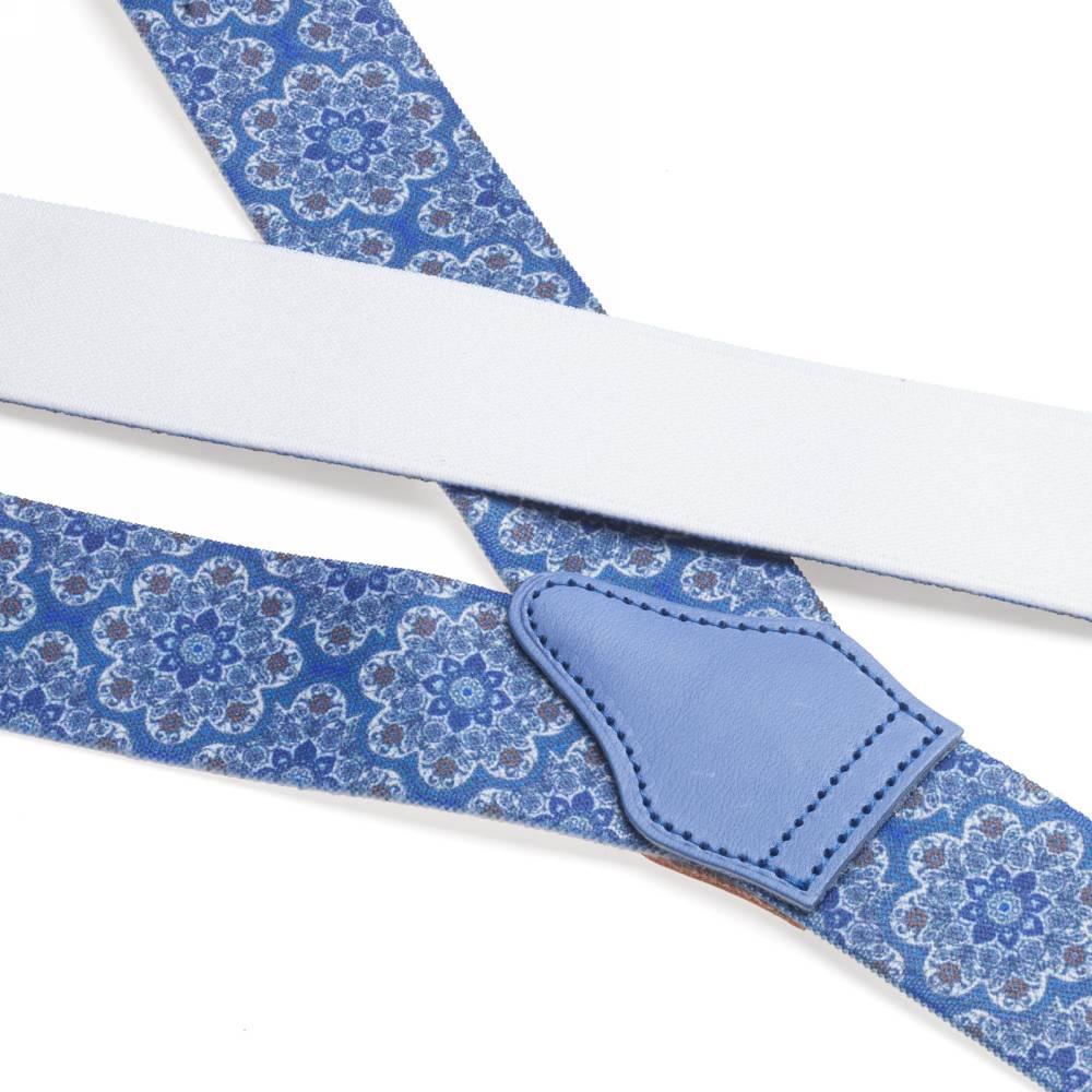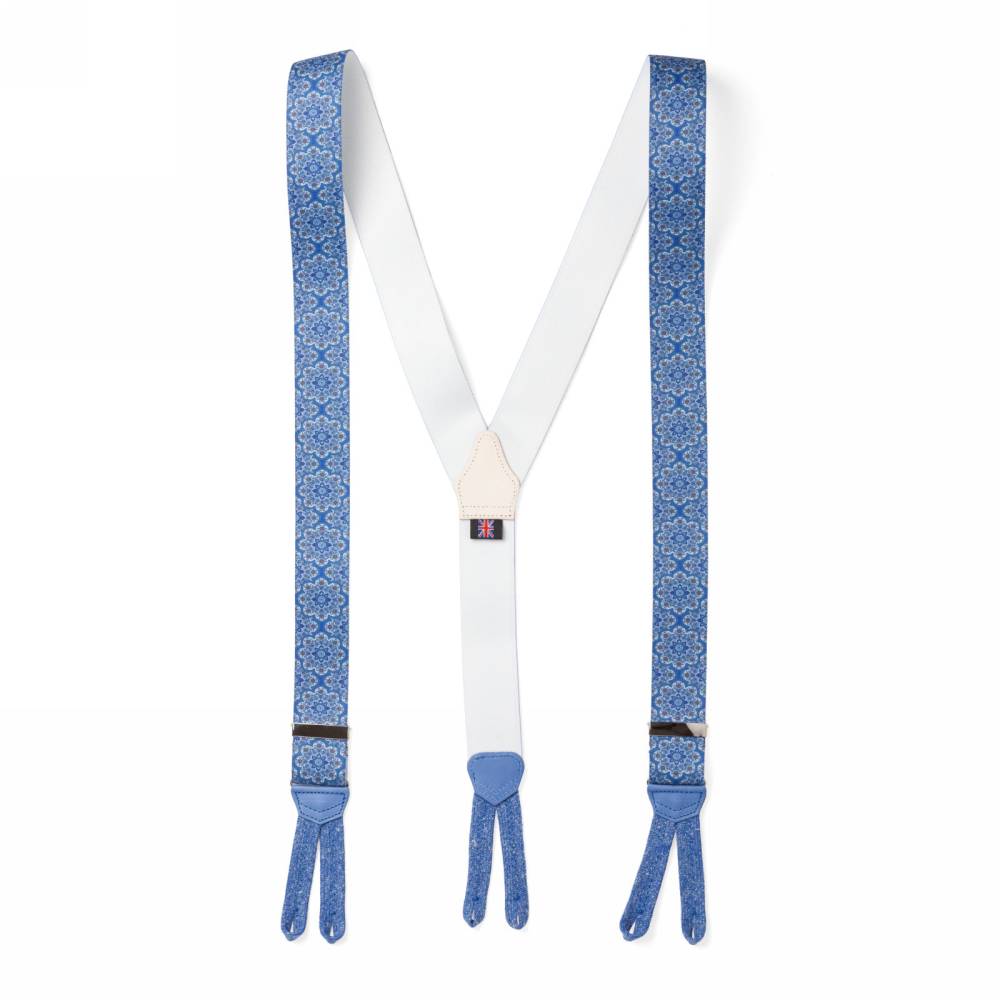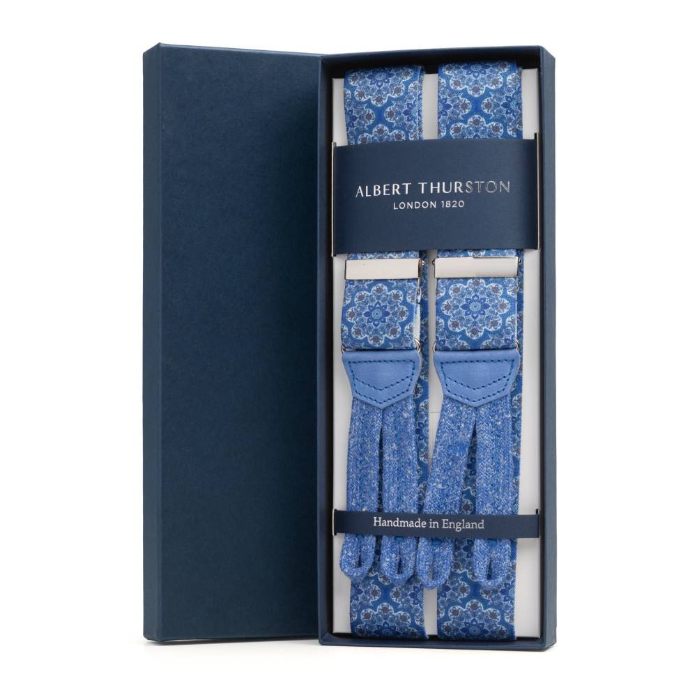 Классические Y-образные подтяжки английского бренда Albert Thurston небесно-голубого цвета. Лента выполнена из эластичного текстиля с цветочным орнаментом, а крепежи петель и спинка – из прочной натуральной кожи. Подтяжки крепятся к брюкам при помощи прочных льняных петель. В комплект входит набор из 6 пуговиц.