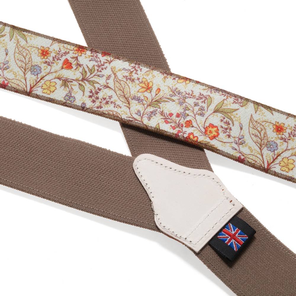 Классические Y-образные подтяжки английского бренда Albert Thurston. Лента выполнена из эластичной ткани с цветочными мотивами, а вставки и спинка – из прочной натуральной кожи (задняя часть подтяжек изготовлена из эластичного материала, что добавляет комфорта при носке). Подтяжки крепятся к брюкам при помощи прочных льняных петель. В комплект входит набор из 6 пуговиц.