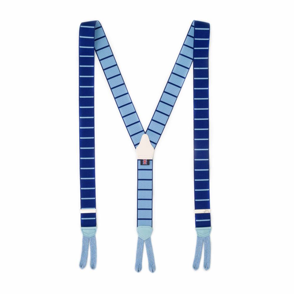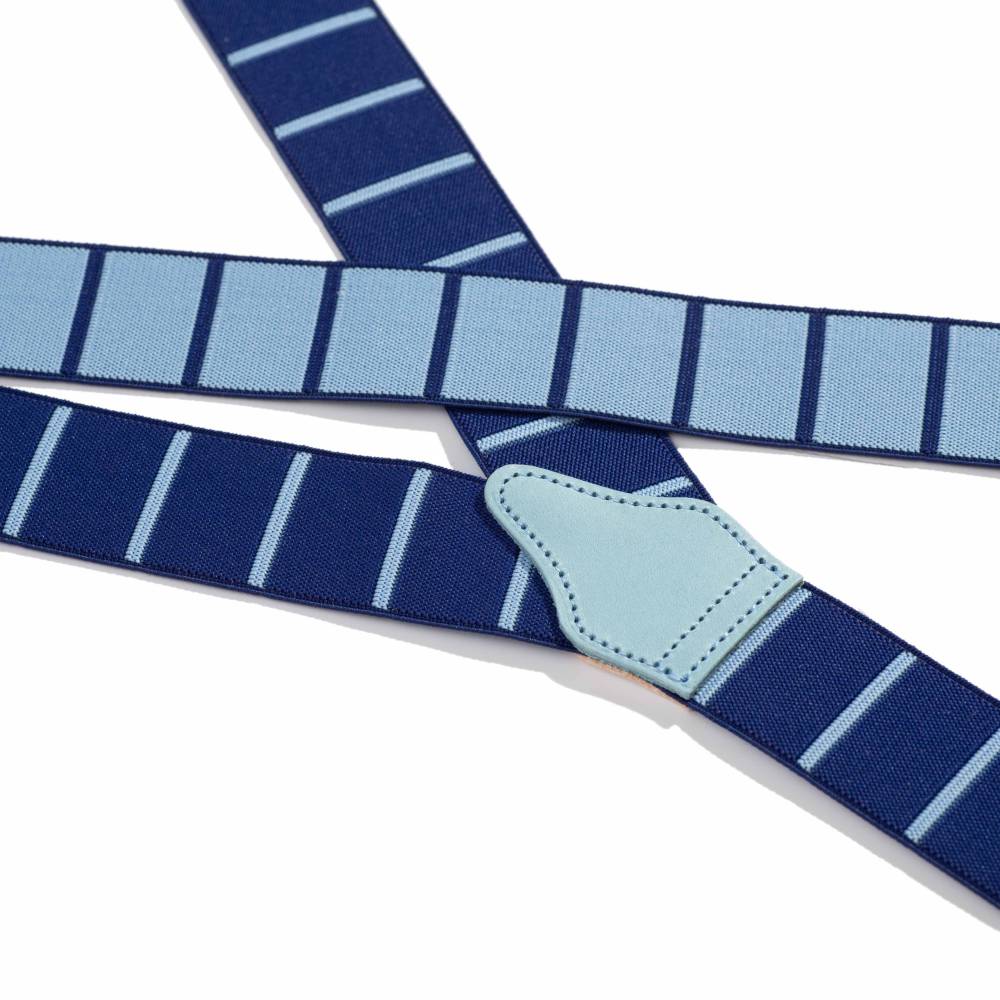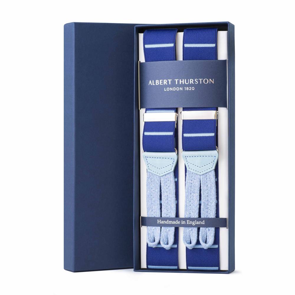 Классические подтяжки английского бренда Albert Thurston. Выполнены в традиционной Y-образной конструкции, которая обеспечивает идеальную посадку. Основная эластичная лента синего цвета украшена горизонтальными полосами голубого цвета, дополнена петлями из льна и вставками из натуральной кожи растительного дубления. В комплекте набор из 6 пуговиц для крепления. В качестве альтернативы можно использовать металлические пуговицы.
