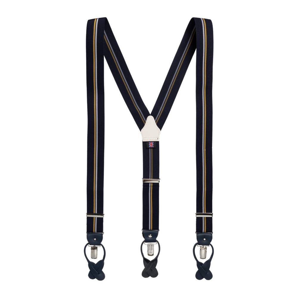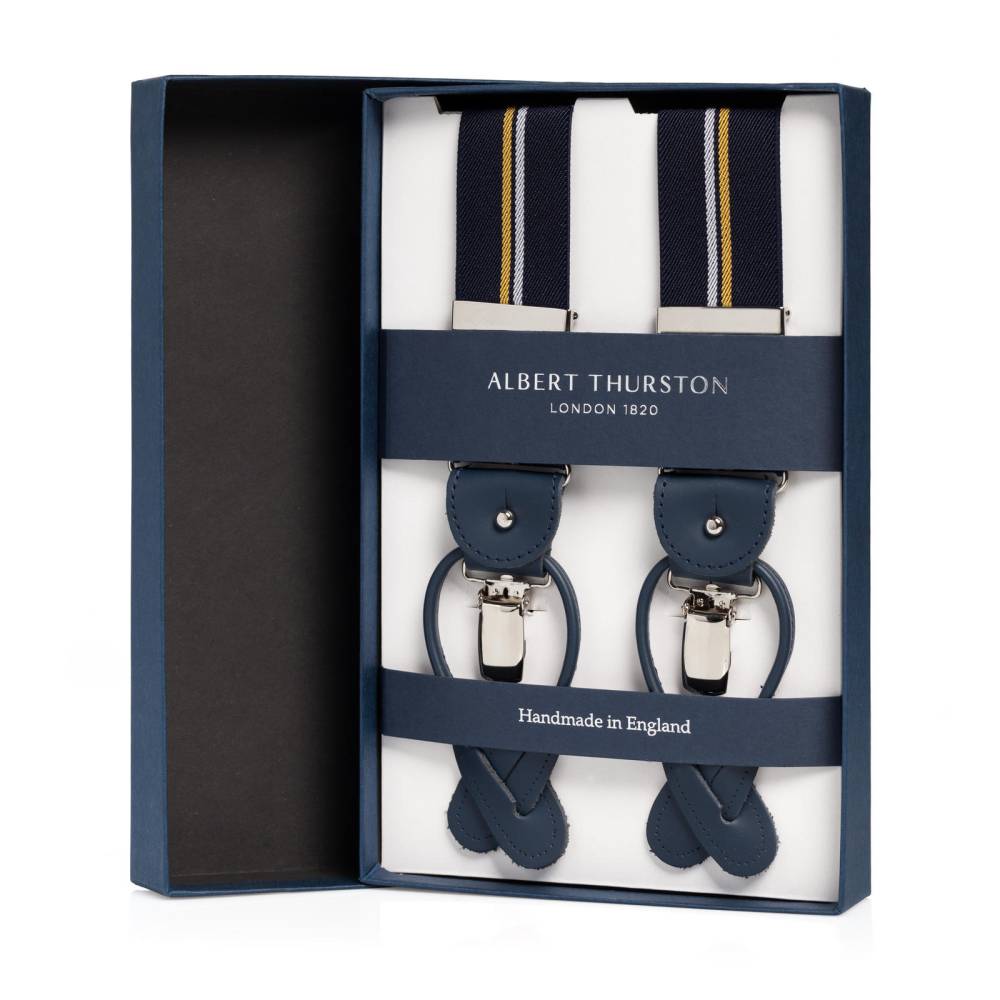 Классические Y-образные подтяжки легендарного английского бренда Albert Thurston. Лента выполнена из хлопка в сочетании с эластаном, а петли и спинка – из прочной натуральной кожи. Подтяжки можно крепить при помощи петель, если брюки имеют пуговицы, либо при помощи металлических зажимов. В комплект входит набор из 6 пуговиц.