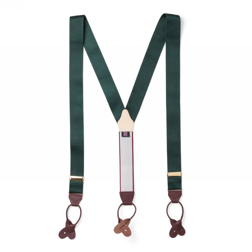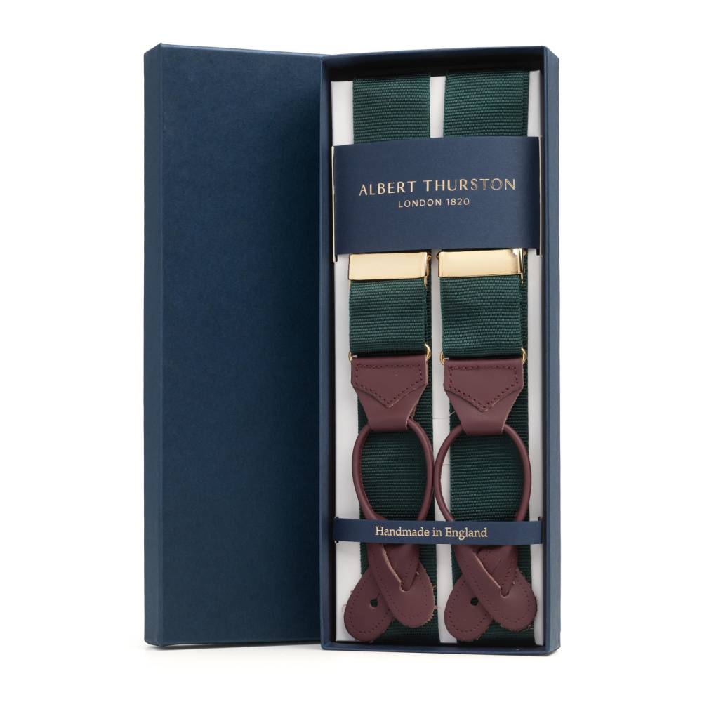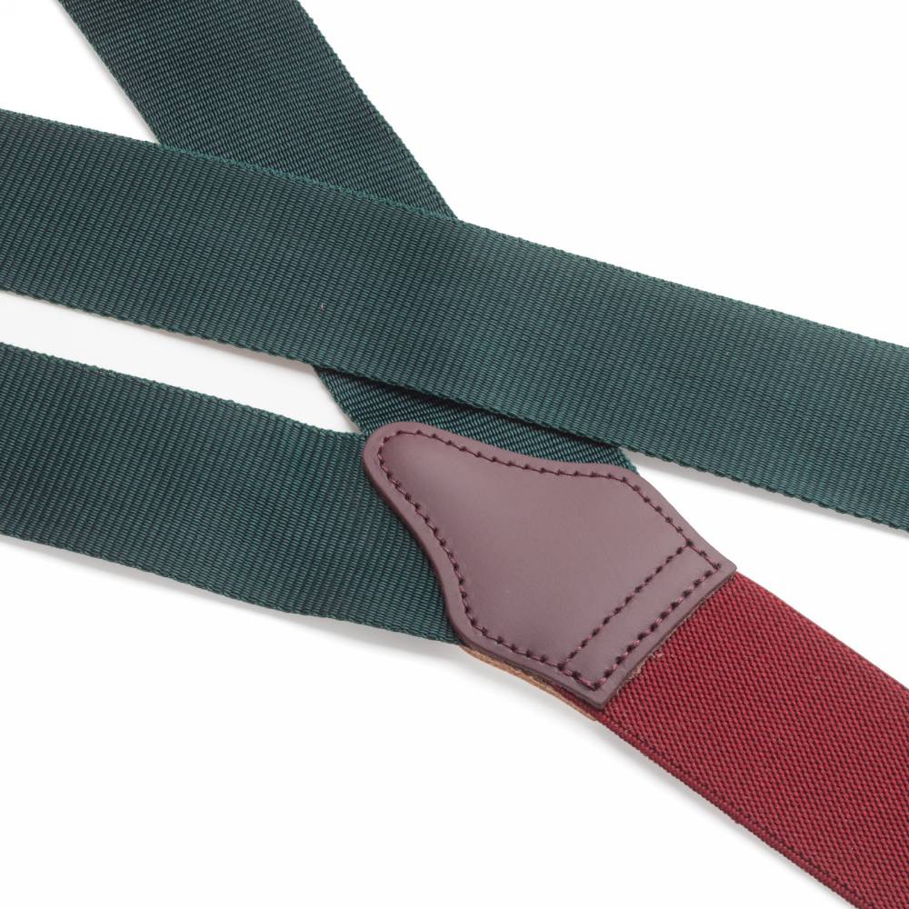 Классические Y-образные подтяжки английского бренда Albert Thurston для повседневного костюма. Лента выполнена из фактурного нейлона (репсовая ткань) зелёного цвета с голубым оттенком. Модель дополнена эластичной вставкой сзади и элементами из телячьей кожи тёмно-коричневого цвета. Подтяжки крепятся при помощи петель к специальным пуговицам на брюках.