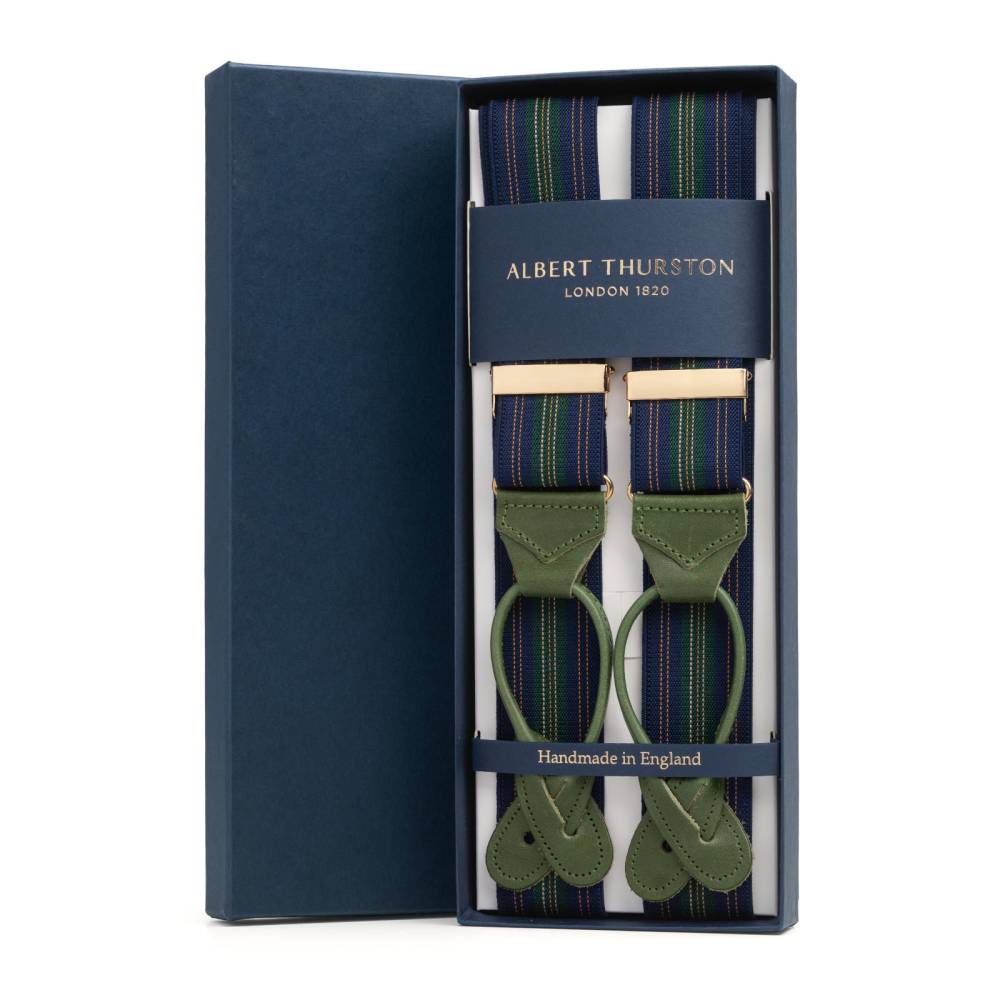 Классические подтяжки английского бренда Albert Thurston. Выполнены в традиционной Y-образной конструкции, которая обеспечивает идеальную посадку. Эластичная лента в тёмно-синих и зелёных тонах дополнена петлями и спинкой из прочной натуральной кожи растительного дубления. В комплект входит набор из шести пуговиц для крепления. В качестве альтернативы можно использовать металлические пуговицы.