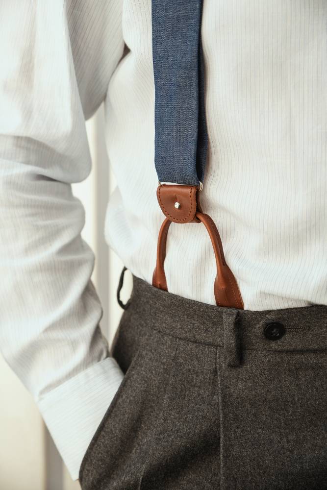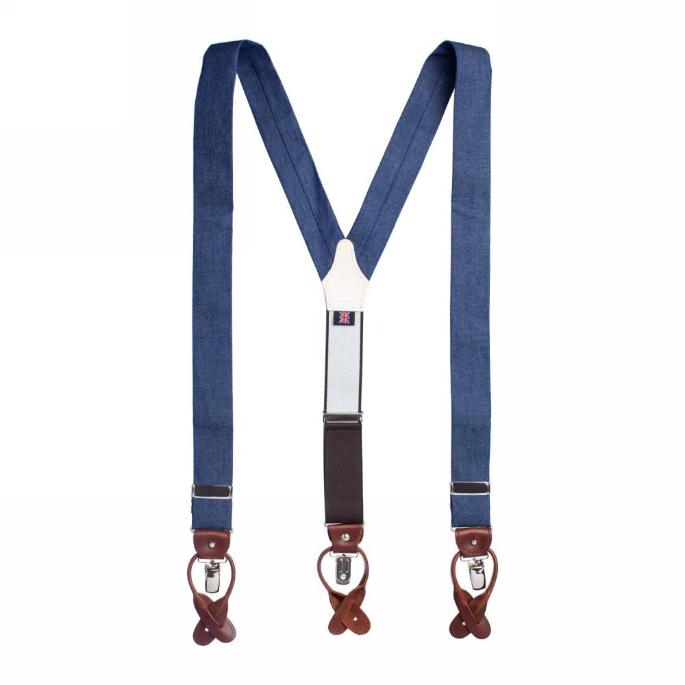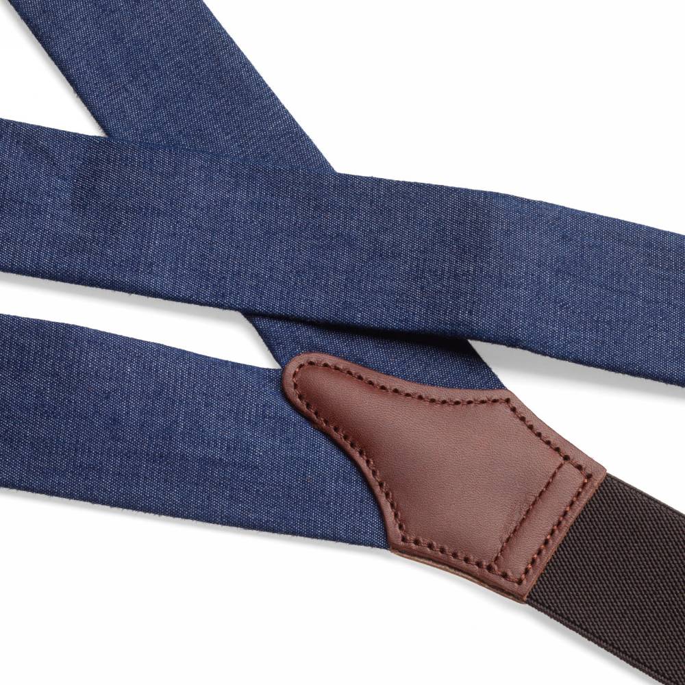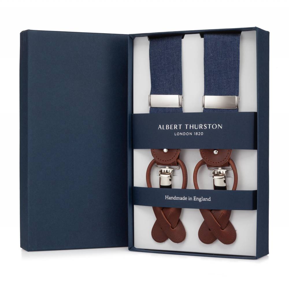 Классические Y-образные подтяжки английского бренда Albert Thurston из тёмно-синего хлопка шамбре, который по фактуре напоминает деним. а Петли и спинка – из прочной натуральной кожи (задняя часть подтяжек изготовлена из эластичного материала, что добавляет комфорта при носке). Подтяжки можно крепить при помощи петель, если брюки имеют пуговицы, либо при помощи металлических зажимов. В комплект входит набор из 6 пуговиц.