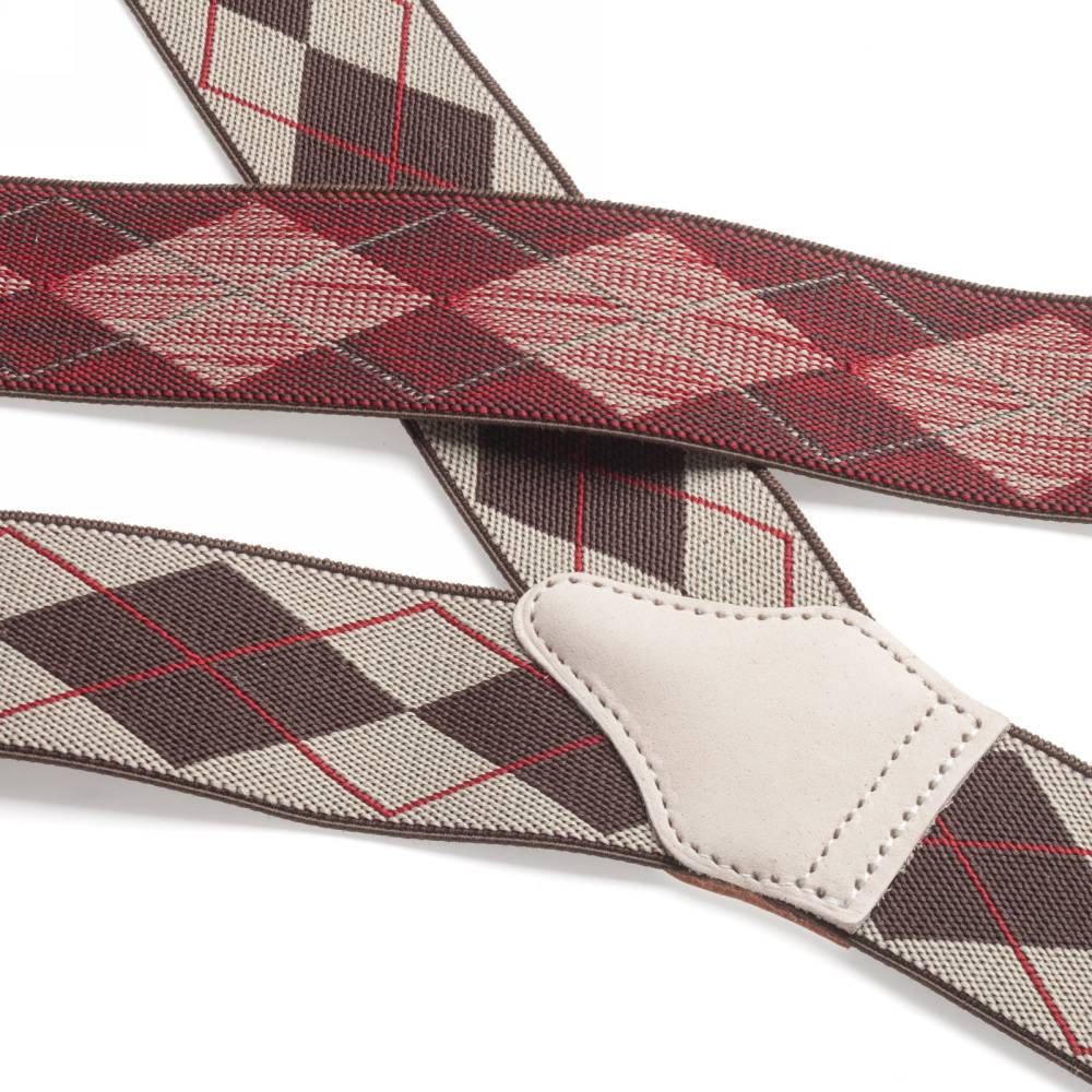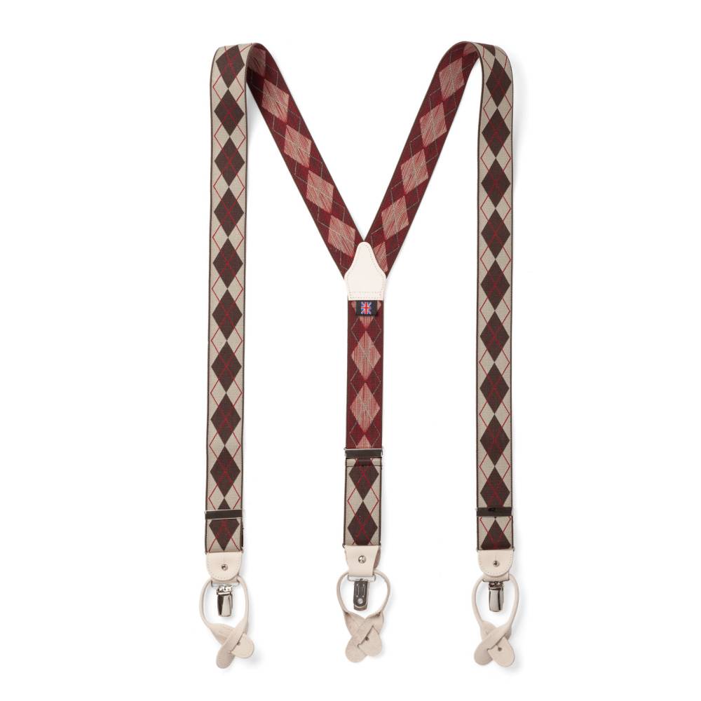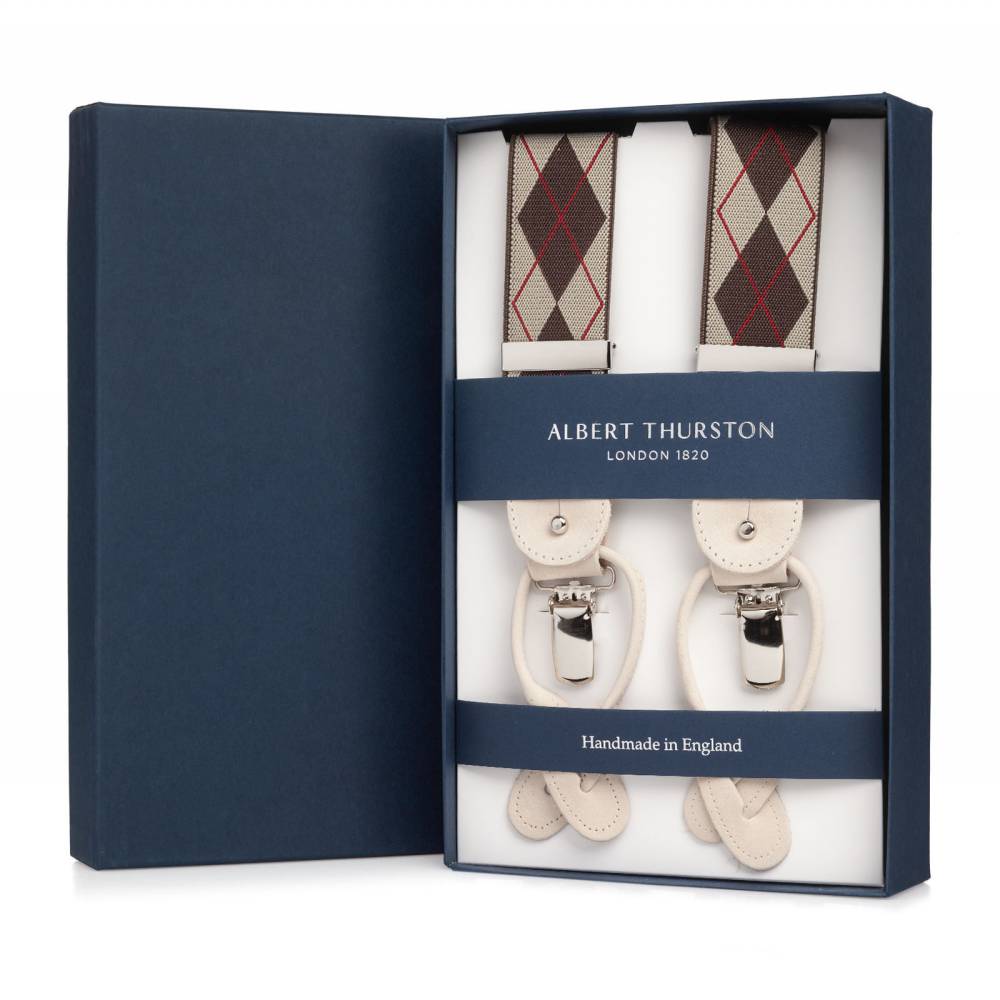 Классические Y-образные подтяжки английского бренда Albert Thurston. Лента, украшенная традиционным узором аргайл, выполнена из смеси хлопка и эластана, а петли и спинка – из прочной натуральной кожи. Подтяжки крепятся к брюкам при помощи петель, если брюки имеют пуговицы, либо при помощи металлических зажимов. В комплект входит набор из 6 пуговиц.