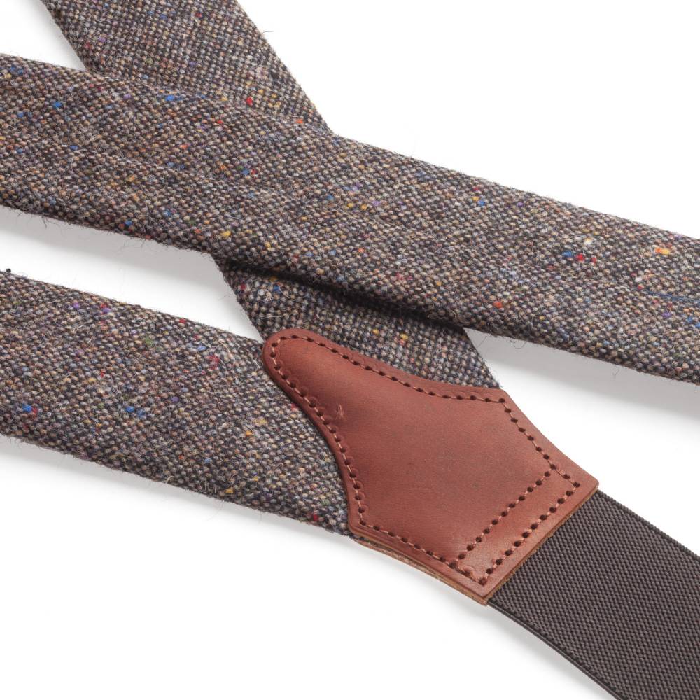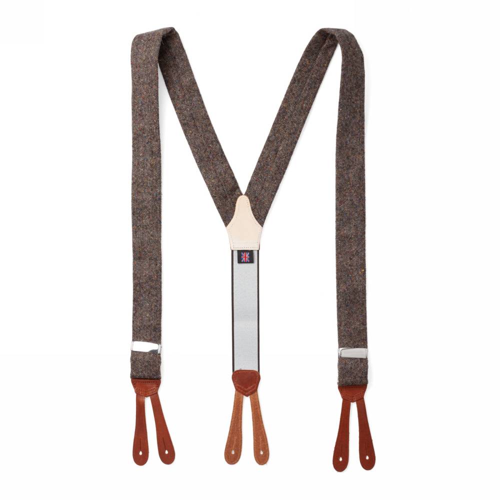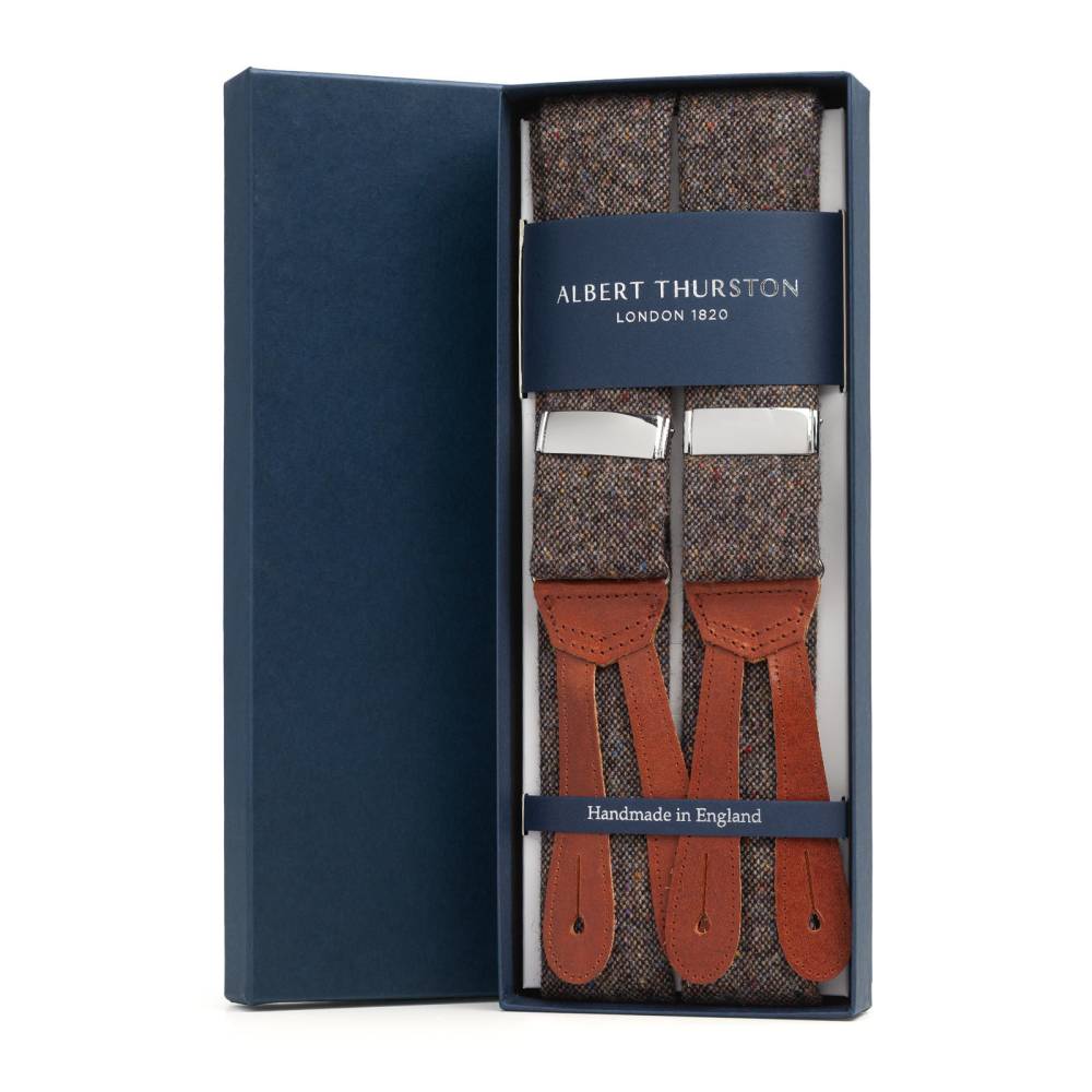 Классические Y-образные подтяжки английского бренда Albert Thurston. Лента выполнена из донегольского твида – 100%-й шерсти бежевого цвета с характерными разноцветными вкраплениями. Петли и спинка – из прочной натуральной кожи. Подтяжки крепятся к брюкам при помощи петель. В комплект входит набор из 6 пуговиц.