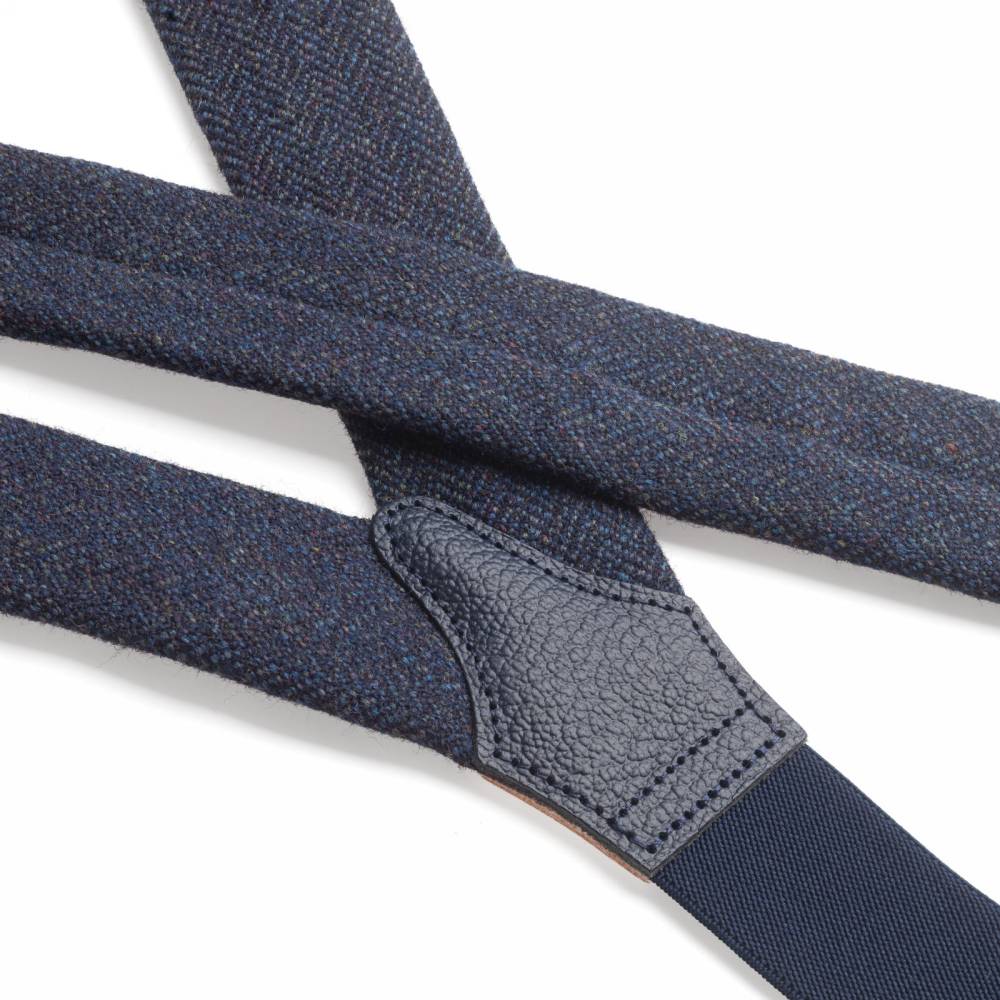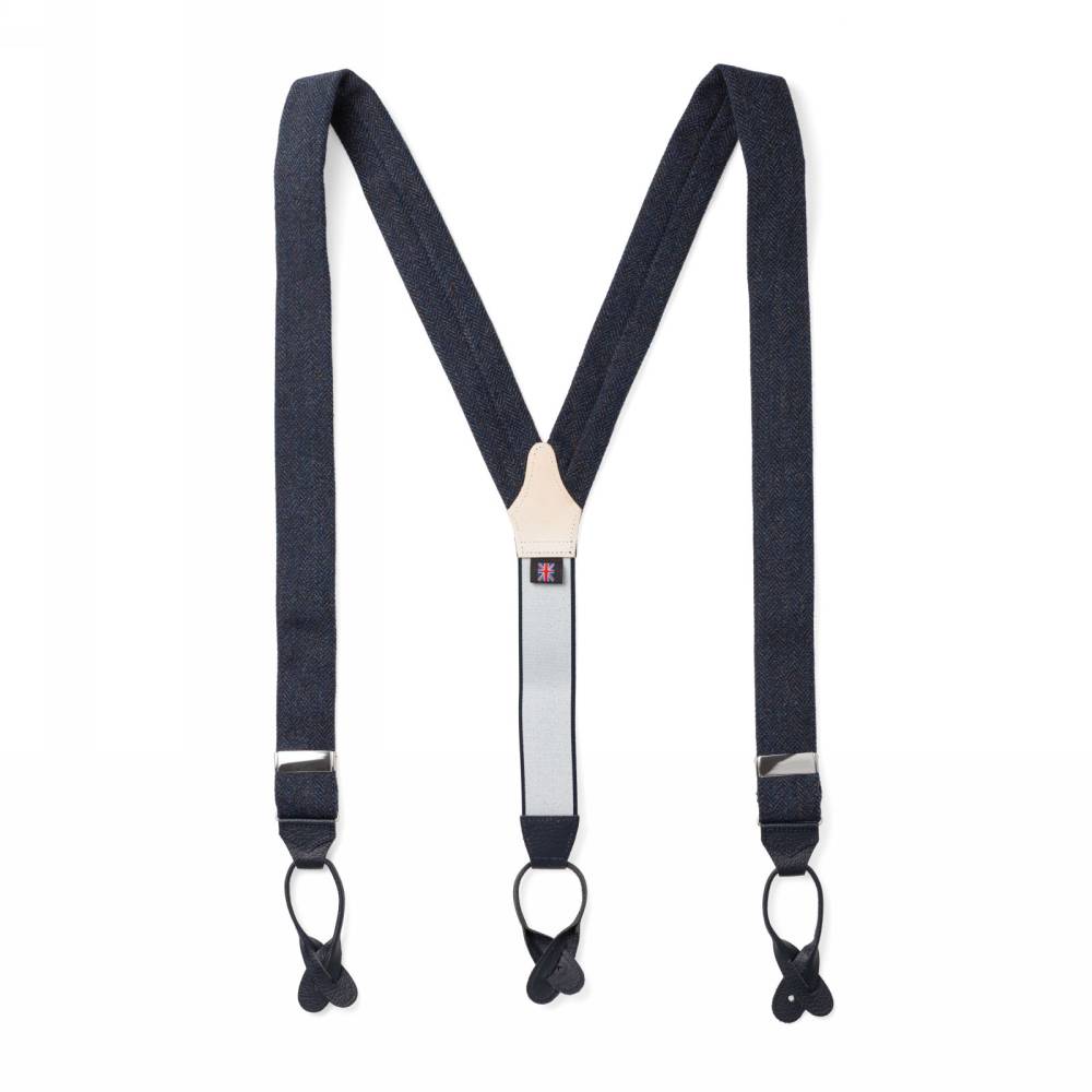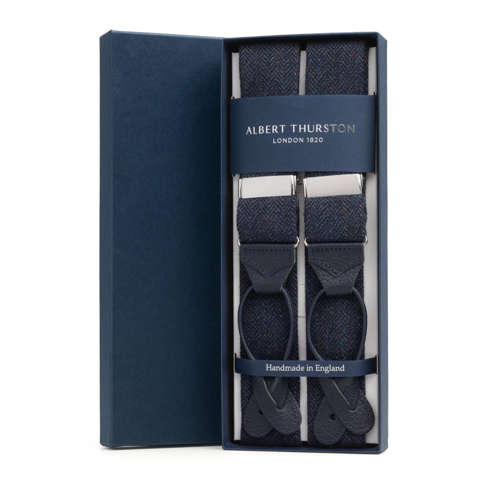 Классические Y-образные подтяжки английского бренда Albert Thurston. Лента выполнена из шотландского твида Harris Tweed® – 100%-й шерсти тёмно-синего цвета в ёлочку. Петли и спинка – из прочной натуральной кожи. Подтяжки крепятся к брюкам при помощи петель. В комплект входит набор из 6 пуговиц.