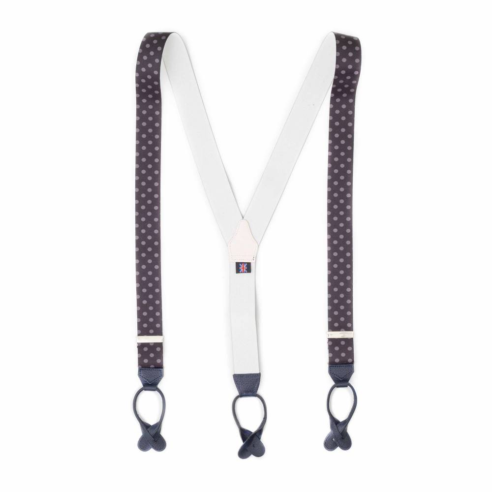 Классические подтяжки ручной работы английского бренда Albert Thurston. Лента выполнена из эластичного текстиля черного цвета и украшена кругами серого цвета. Петли из зернистой натуральной кожи черного цвета. Металлические скользящие зажимы с тисненым логотипом помогают регулировать размер индивидуально для каждого. В комплект входит набор из 6 пуговиц. Традиционная Y-образная конструкция.