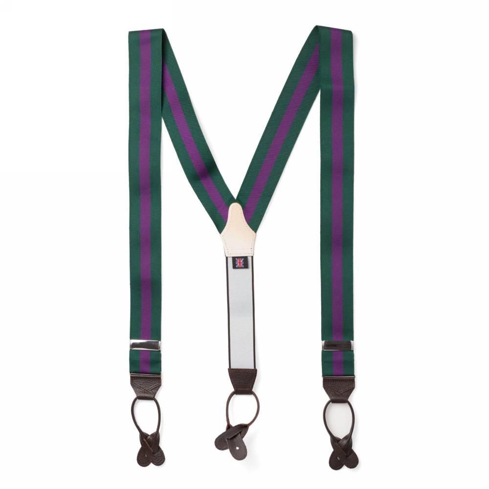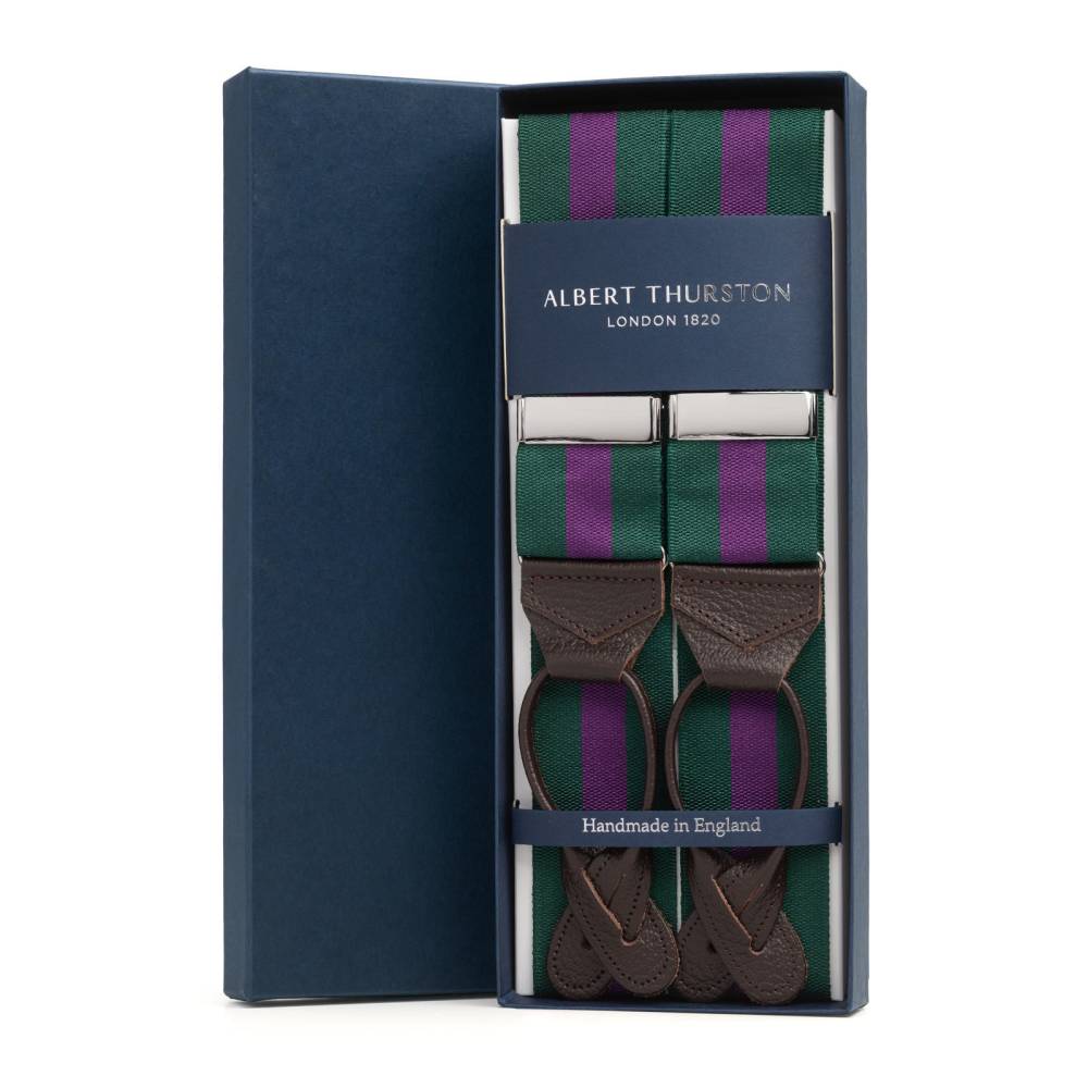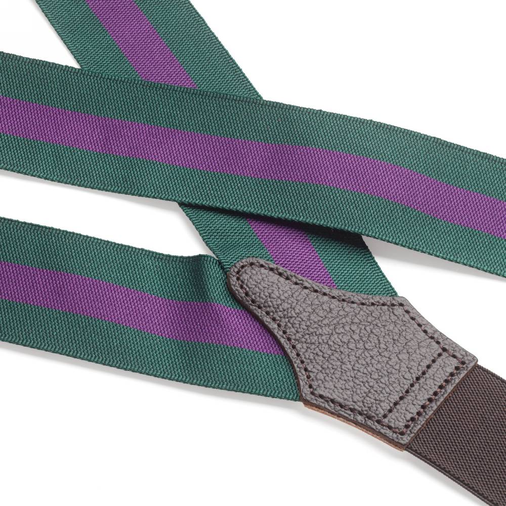 Классические Y-образные подтяжки легендарного английского бренда Albert Thurston. Лента выполнена из неэластичного текстиля (репс) зелёного цвета с фиолетовой полосой, а петли и спинка – из прочной зернистой кожи. Задняя часть подтяжек изготовлена из эластичного материала, что добавляет комфорта при носке. Подтяжки крепятся к брюкам при помощи петель. В комплект входит набор из 6 пуговиц.