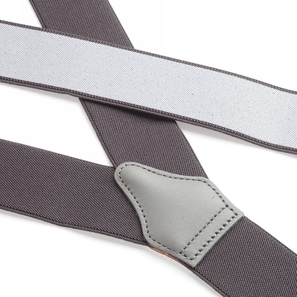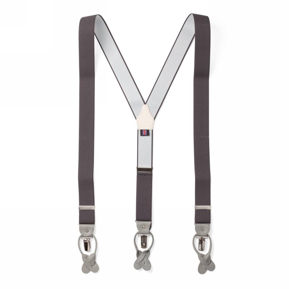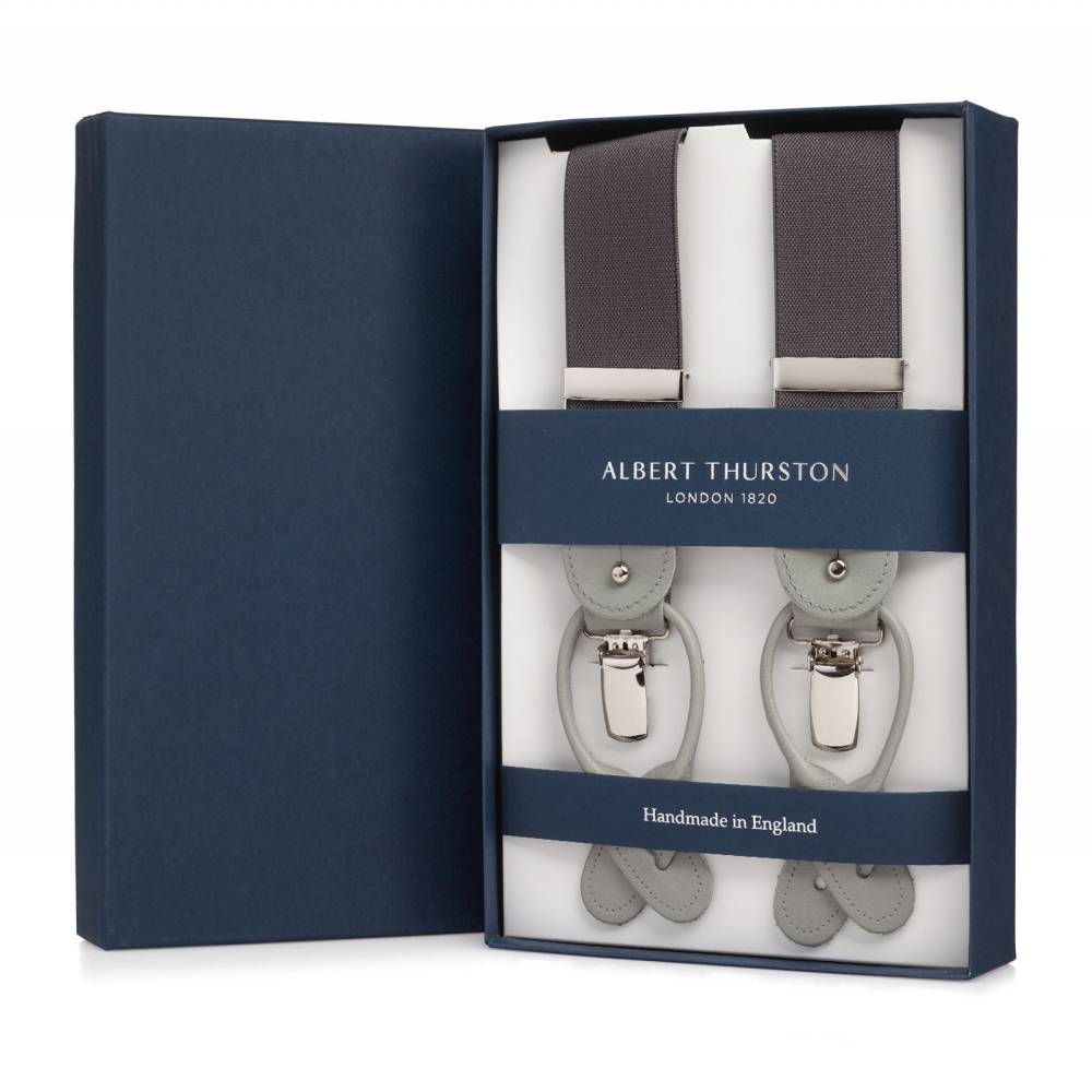 Классические серые Y-образные подтяжки английского бренда Albert Thurston. Лента выполнена из эластичного текстиля, а петли и спинка – из прочной натуральной кожи. Подтяжки можно крепить при помощи петель, если брюки имеют пуговицы, либо при помощи металлических зажимов. В комплект входит набор из 6 пуговиц.