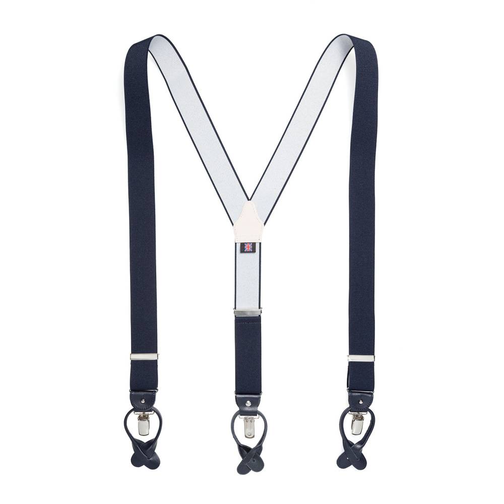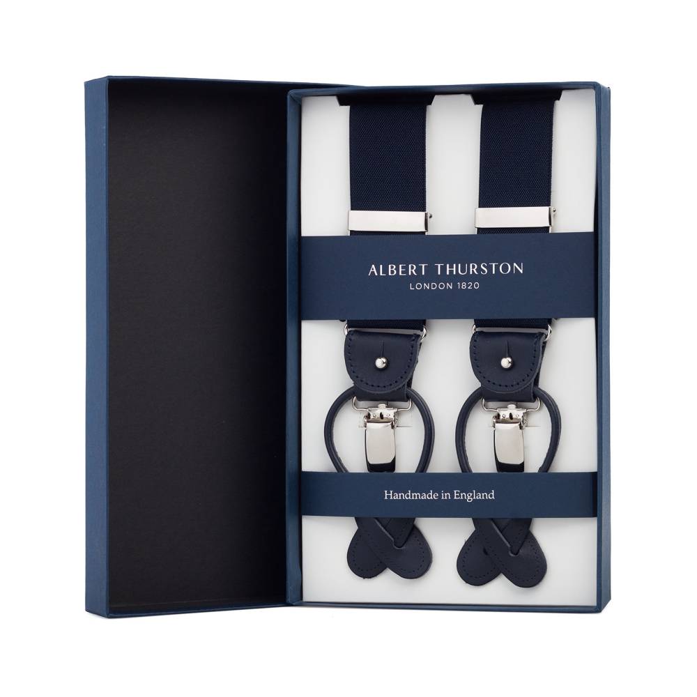 Классические тёмно-синие Y-образные подтяжки английского бренда Albert Thurston. Лента выполнена из эластичного текстиля, а петли и спинка – из прочной натуральной кожи. Подтяжки можно крепить при помощи петель, если брюки имеют пуговицы, либо при помощи металлических зажимов. В комплект входит набор из 6 пуговиц. Данная модель также доступна с металлическими элементами золотистого цвета.
