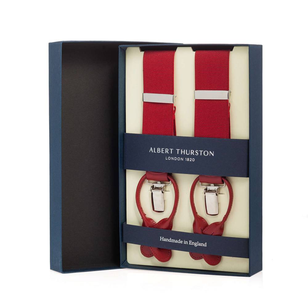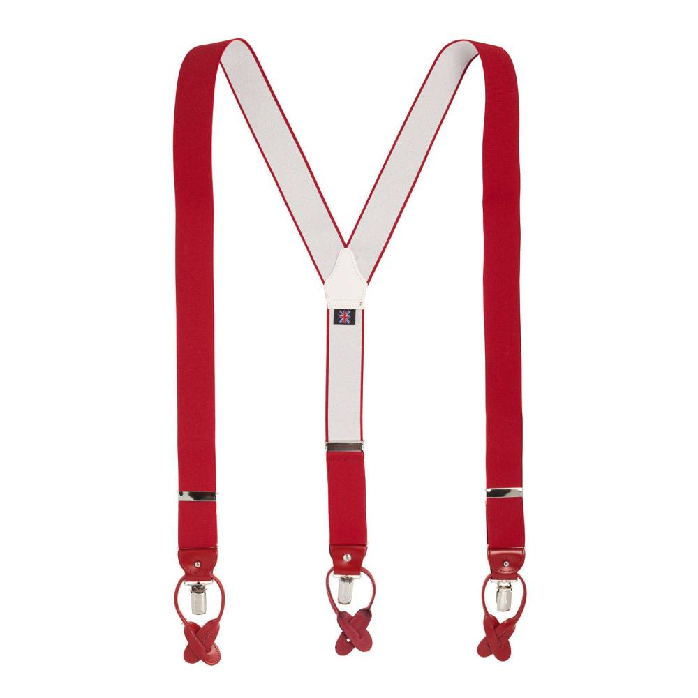 Классические красные Y-образные подтяжки английского бренда Albert Thurston. Лента выполнена из эластичного текстиля, а петли и спинка – из прочной натуральной кожи. Подтяжки можно крепить при помощи петель, если брюки имеют пуговицы, либо при помощи металлических зажимов. В комплект входит набор из 6 пуговиц. Данная модель также доступна с металлическими элементами золотистого цвета.