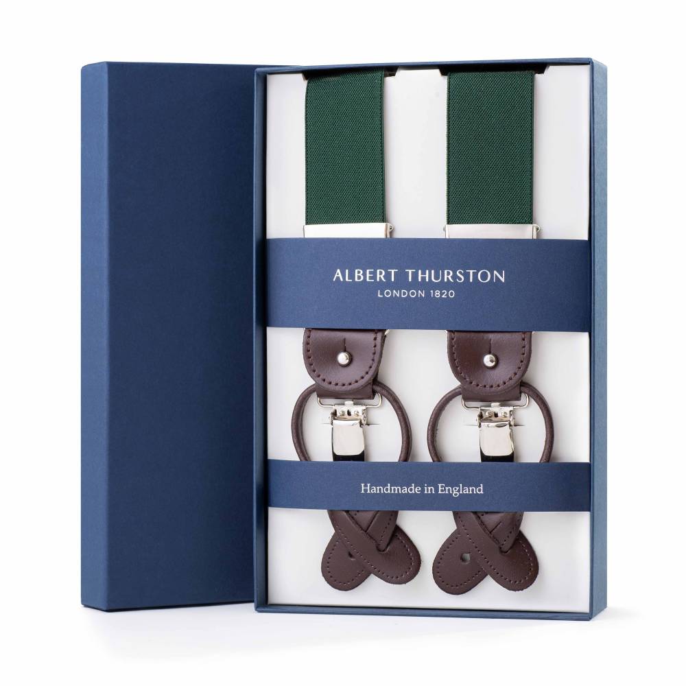 Классические однотонные подтяжки английского бренда Albert Thurston. Лента выполнена из эластичного текстиля зелёного цвета, а петли и спинка – из прочной натуральной кожи коричневого оттенка. Подтяжки крепятся к брюкам при помощи петель, если брюки имеют пуговицы, либо при помощи металлических зажимов. В комплект входит набор из 6 пуговиц.