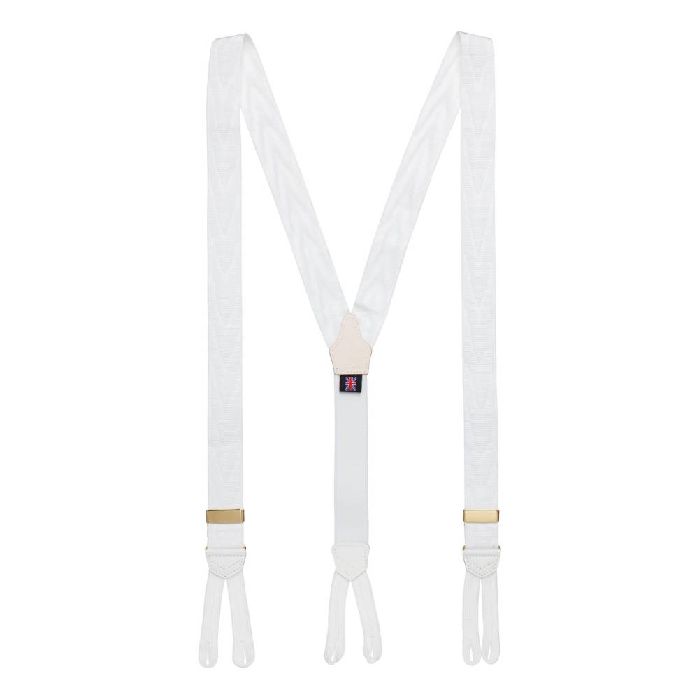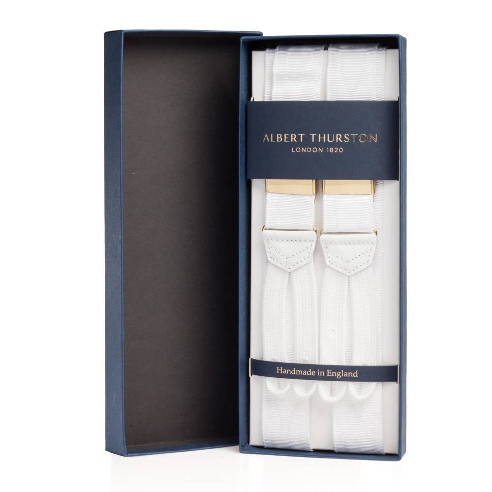 Классические Y-образные подтяжки английского бренда Albert Thurston для максимально формальных мероприятий с дресс-кодом White Tie или Black Tie. Лента выполнена из фактурного нейлона (репсовая ткань), дополнена эластичной вставкой сзади и элементами из высококачественной телячьей кожи. Подтяжки крепятся при помощи традиционных тканевых петель. Именно эти подтяжки были на Дэниэле Крейге в блокбастере "007: Казино Рояль".