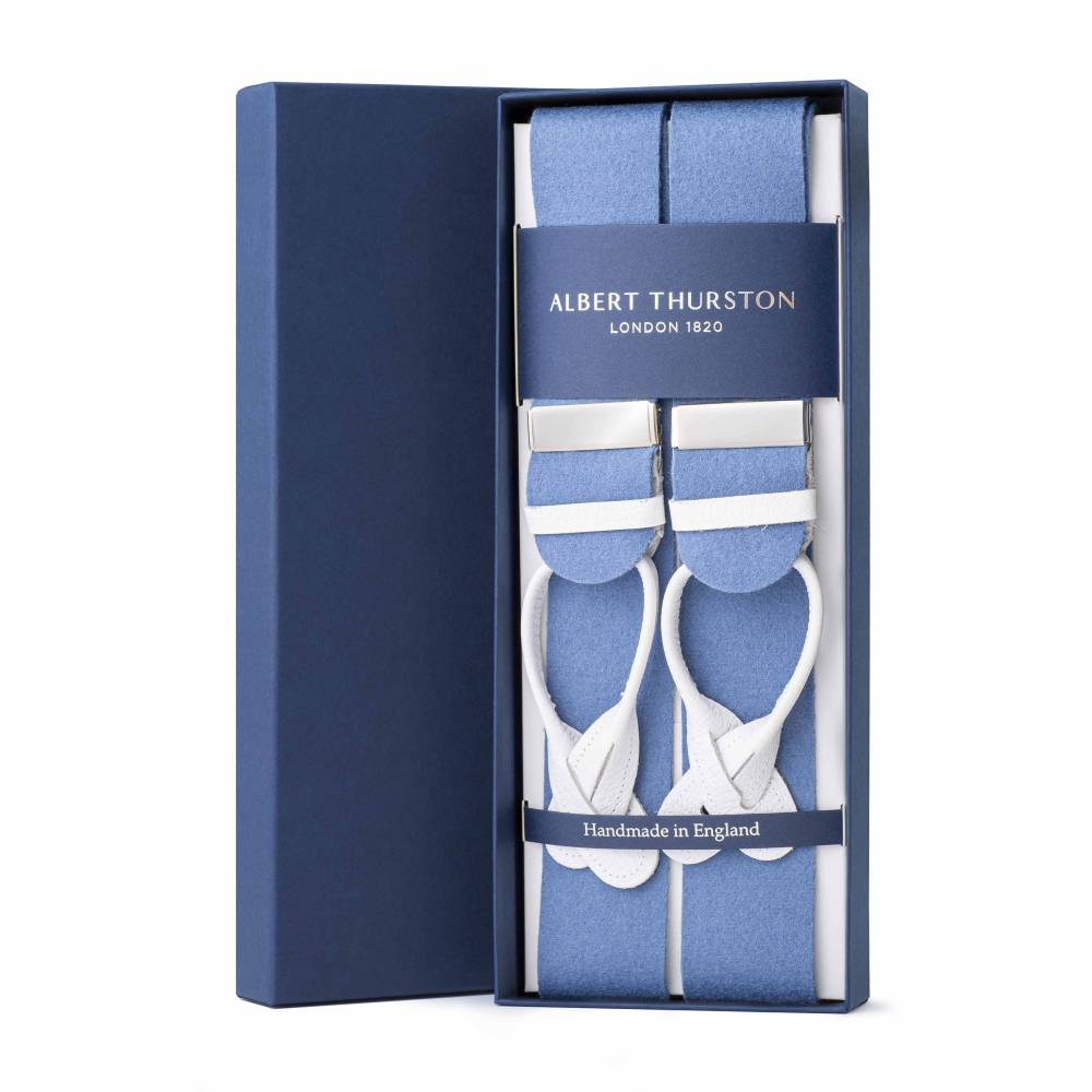 Широкие подтяжки английского бренда Albert Thurston небесно-голубого цвета. Основные ленты выполнены из плотной неэластичной шерстяной ткани с ворсистой поверхностью, напоминающей плотную фланель. Конструкция спинки X-образной формы не только выглядит эффектно, но и обеспечивает особое удобство за счёт эластичных дополнительных лент. Петли и отделочные элементы выполнены из телячьей кожи белого цвета с зернистой фактурой. Стоит также отметить узорную форму кожаных элементов в виде лепестков на спинке. Модель представляет собой один из самых первых вариантов подтяжек, созданных в начале 19-го века: металлические зажимы зафиксированы на одном месте, а ленты продеваются сквозь них для регулировки размера, поэтому их края уходят вниз. В комплекте набор из 6 пуговиц.