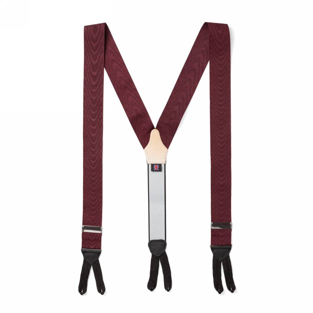 Подтяжки английского бренда Albert Thurston изготовлены вручную в традиционной Y-образной конструкции. Идеально подходят для строгих формальных мероприятий с дресс-кодом Black Tie. Муаровая бордовая лента из фактурного нейлона с лёгким блеском дополнена элементами из высококачественной кожи. Плетеные нейлоновые петли, обеспечивают гибкую фиксацию. Эластичная вставка сзади создает идеальную посадку и свободу движений. Размер легко регулируется металлическими зажимами с тисненым логотипом. В комплекте 6 пуговиц. В качестве альтернативы можно использовать металлические пуговицы.