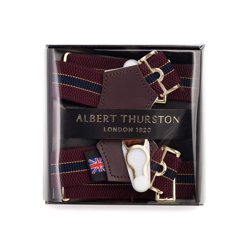 Классические подтяжки для носков английского бренда Albert Thurston. Лента выполнена из хлопка в сочетании с эластаном. Вставки из прочной натуральной кожи.