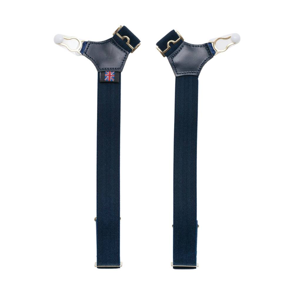 Лаконичные тёмно-синие подтяжки для носков английского бренда Albert Thurston с фактурным узором "ёлочка". Лента выполнена из эластичного текстиля. Вставки из прочной натуральной кожи в тон ленте.