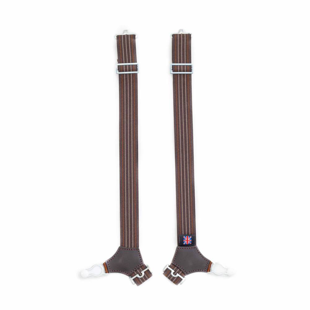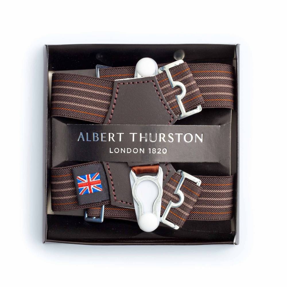 Лаконичные тёмно-коричневые подтяжки для носков английского бренда Albert Thurston. Лента выполнена из эластичного текстиля в полоску. Вставки из прочной натуральной кожи в тон ленте.