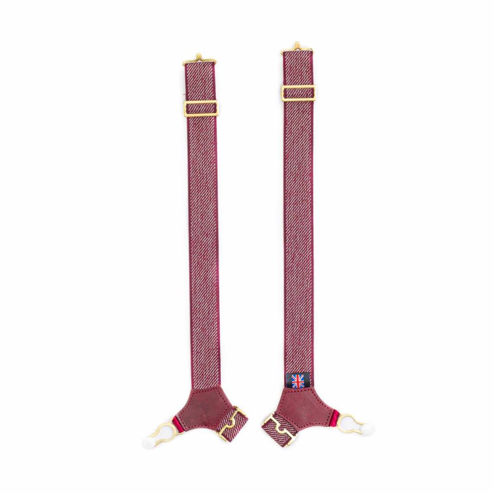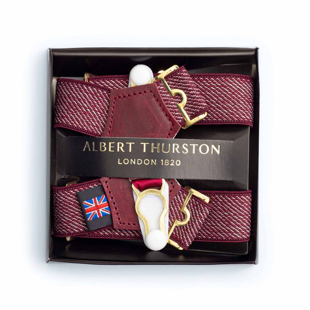 Лаконичные бордовые подтяжки для носков английского бренда Albert Thurston. Лента выполнена из эластичного текстиля. Вставки из прочной натуральной кожи в тон ленте.