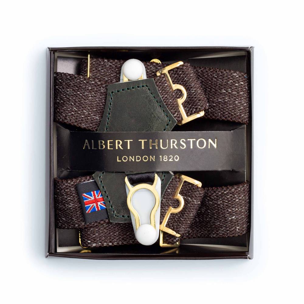 Лаконичные тёмно-зелёные подтяжки для носков английского бренда Albert Thurston. Лента выполнена из эластичного текстиля. Вставки из прочной натуральной кожи в тон ленте.