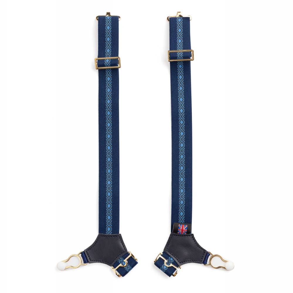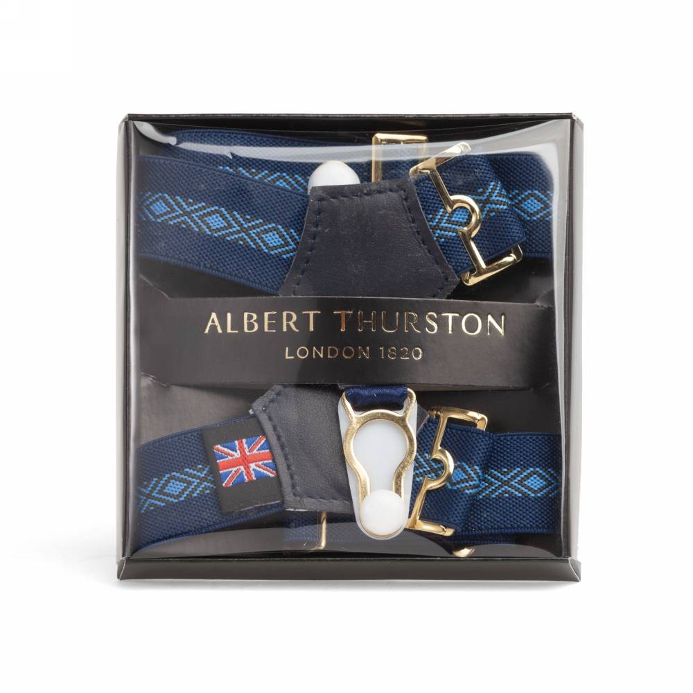 Лаконичные тёмно-синие подтяжки для носков английского бренда Albert Thurston с ромбовидным орнаментом. Лента выполнена из эластичного текстиля. Вставки из прочной натуральной кожи в тон ленте.