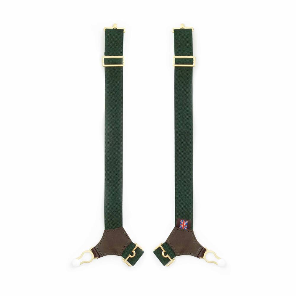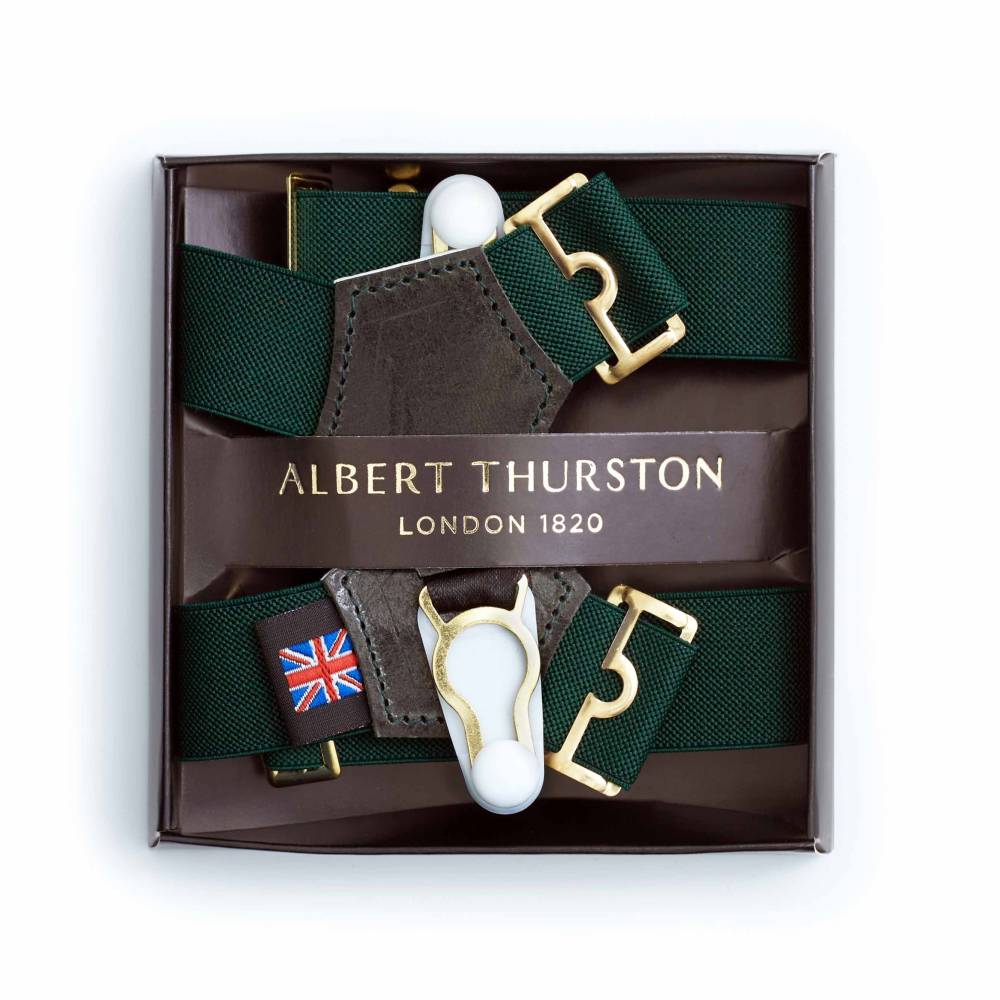 Однотонные подтяжки для носков английского бренда Albert Thurston. Лента выполнена из эластичного текстиля зелёного цвета. Вставки из прочной натуральной кожи в тон ленте.