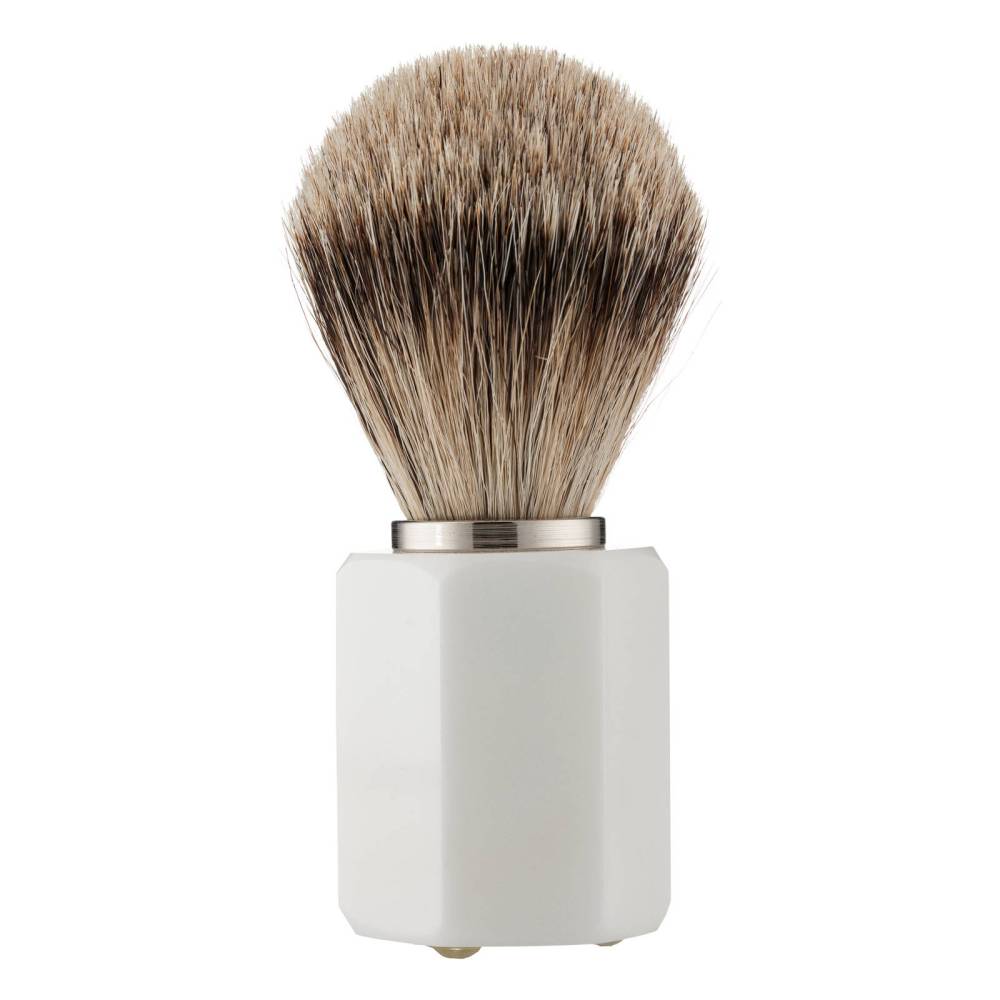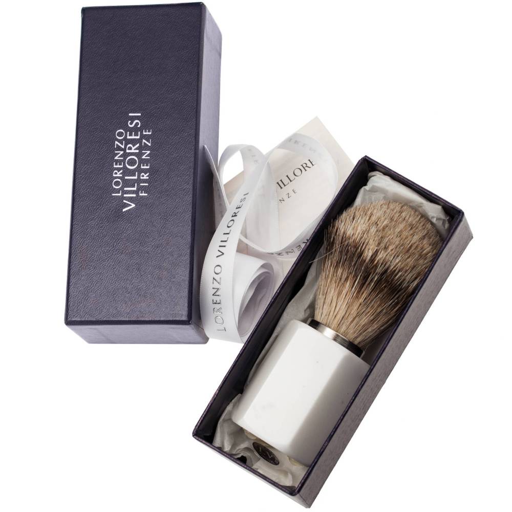 Роскошный помазок Lorenzo Villoresi изготовлен из уникального каррарского мрамора белого цвета. Такой мрамор добывается только в Апуанских Альпах на территории города Каррары (Италия) и считается самым ценным сортом. Помазок выполнен в традиционной для бренда гранёной форме. Щетина выполнена из густого и мягкого барсучьего меха. На дне помазок дополнен силиконовыми ножками для устойчивости. Великолепный аксессуар прекрасно дополнит бритвенный набор джентльмена и украсит интерьер ванной комнаты. Помазок представлен в фирменной коробке.