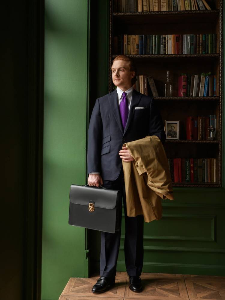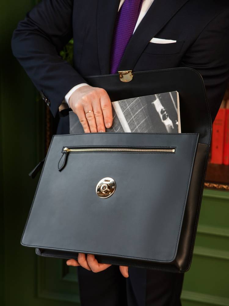 Мужской портфель с клапаном на замке итальянской мануфактуры Boldrini Selleria. Выполнен из аутентичной тосканской кожи растительного дубления Pelle Conciata al Vegetale в черном цвете. Закрывается на клапан с золотистым замком, ключ к которому скрыт в кожаном брелоке. Внутри отделение с карманом на молнии и слотом для мобильного телефона. Подкладка из бархатистой бежевой алькантары. С внешней стороны предусмотрено плоское отделение с декоративной застежкой-штифтом, подходящее для документов и авиабилетов. Декорирован кожаной подвеской с логотипом.