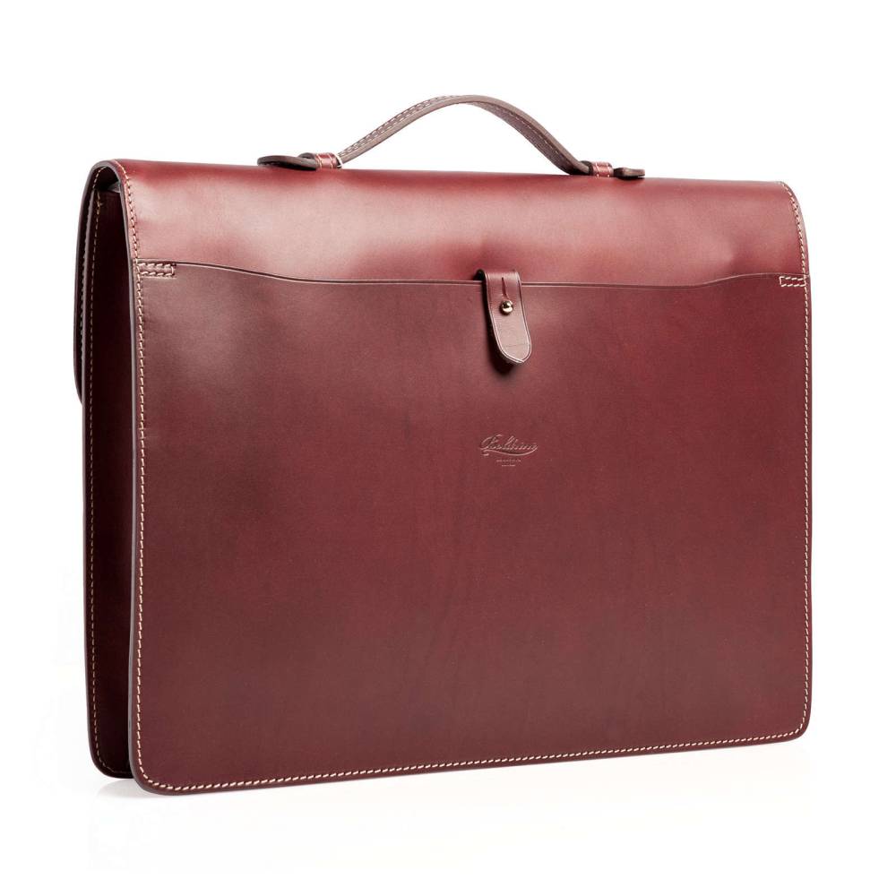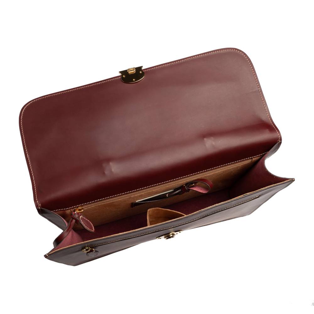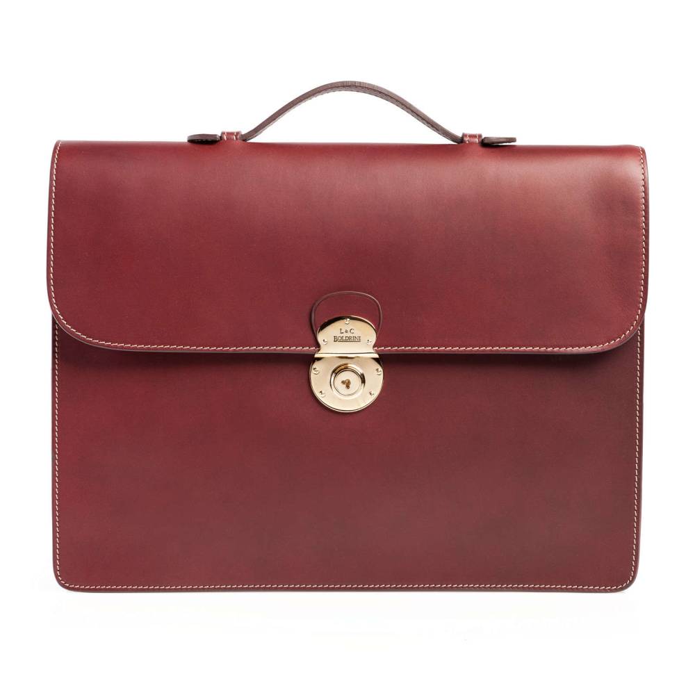 Компактный мужской портфель Boldrini Selleria выполнен из гладкой натуральной кожи бордового цвета с контрастной отстрочкой. Модель закрывается на клапан с металлическим замком золотистого цвета. Ключ к замку находится внутри на кожаной подвеске. Внутри одно боковое отделение на молнии и карман для мобильного телефона. С внешней стороны модель имеет два плоских отделения для документов и билетов: на молнии и с застёжкой-штифтом. Подкладка выполнена из высококачественной бархатистой алькантары бежевого цвета. Портфель декорирован кожаной подвеской с логотипом.