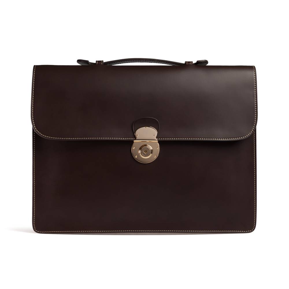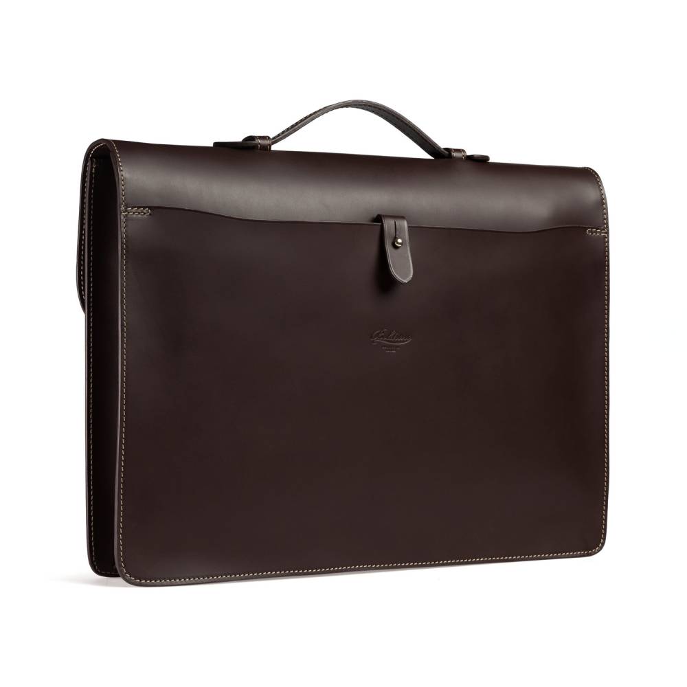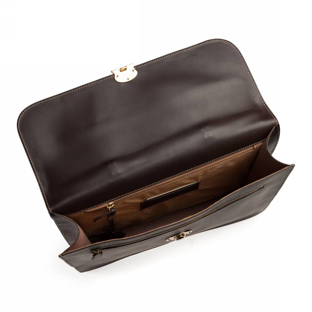 Мужской портфель с клапаном на замке итальянской мануфактуры Boldrini Selleria. Выполнен из аутентичной тосканской кожи растительного дубления Pelle Conciata al Vegetale в тёмно-коричневом цвете. Закрывается на клапан с золотистым замком, ключ к которому скрыт в кожаном брелоке. Внутри отделение с карманом на молнии и слотом для мобильного телефона. Подкладка из бархатистой бежевой алькантары. С внешней стороны предусмотрено плоское отделение с декоративной застежкой-штифтом, подходящее для документов и авиабилетов. Декорирован кожаной подвеской с логотипом.