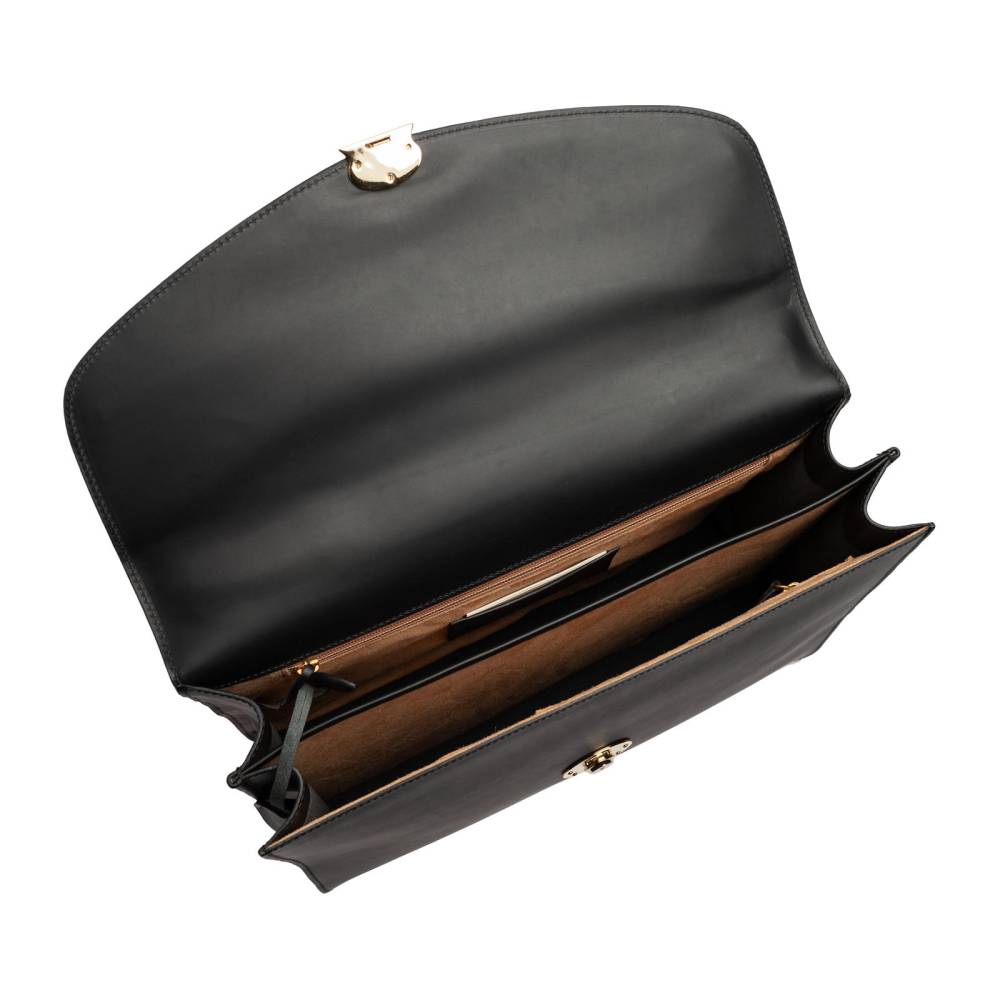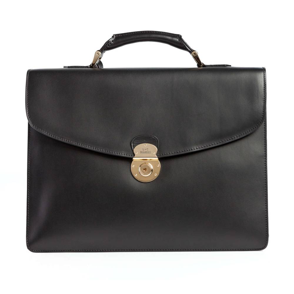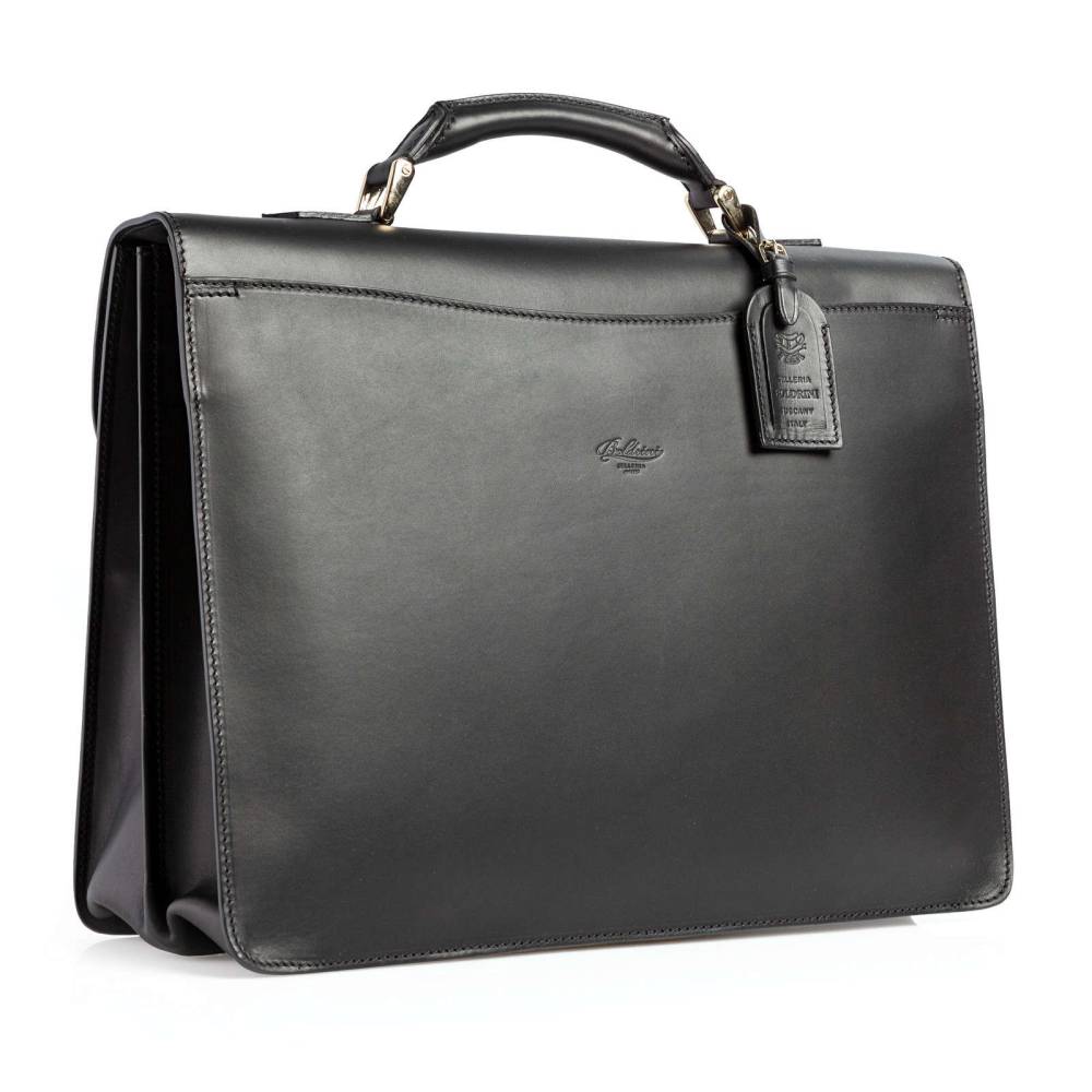 Вместительный мужской портфель Boldrini Selleria полностью выполнен из гладкой кожи чёрного цвета. Модель закрывается на клапан с металлическим замком золотистого цвета. Ключ к замку находится внутри на кожаной подвеске. Внутри две секции, три кармана на молнии для ценных вещей, отделения для билетов, мобильного телефона и визиток. Подкладка выполнена из высококачественной бархатистой алькантары бежевого цвета. С внешней стороны расположено плоское отделение на магнитной застёжке для бумаг. Портфель декорирован кожаной подвеской с логотипом.
