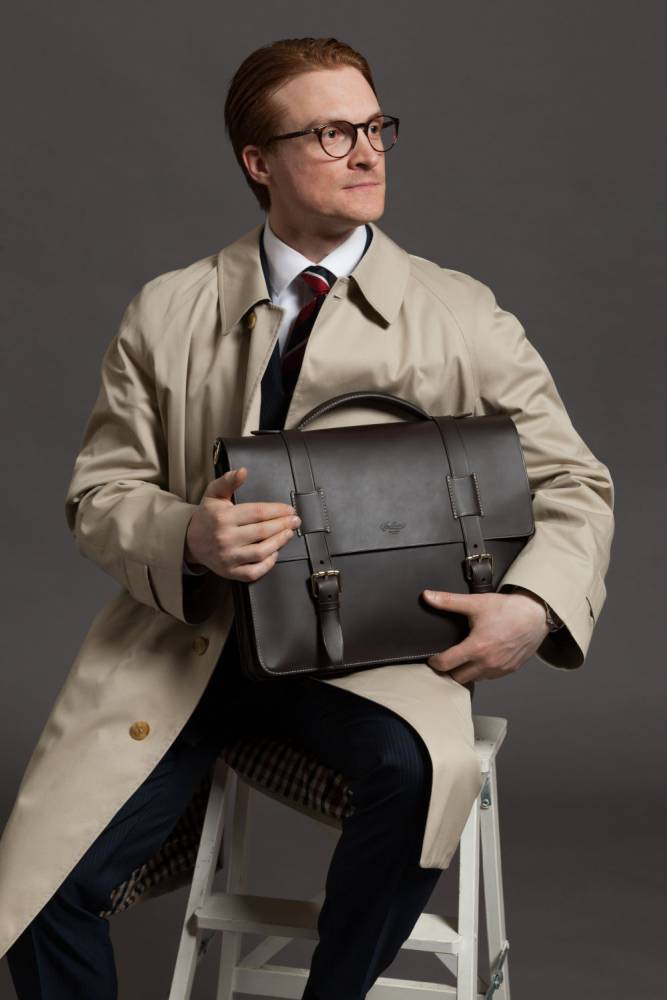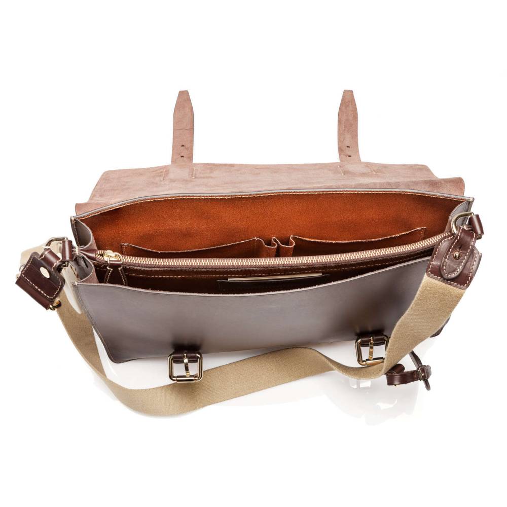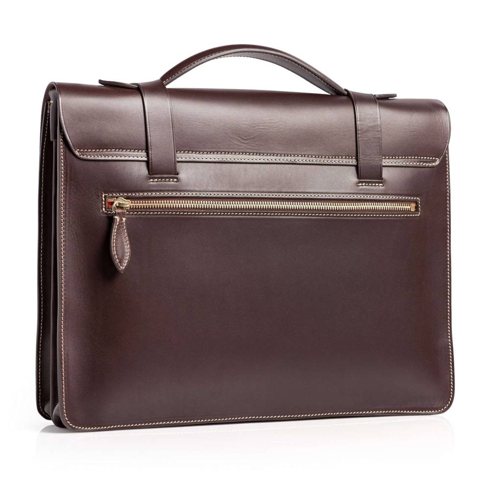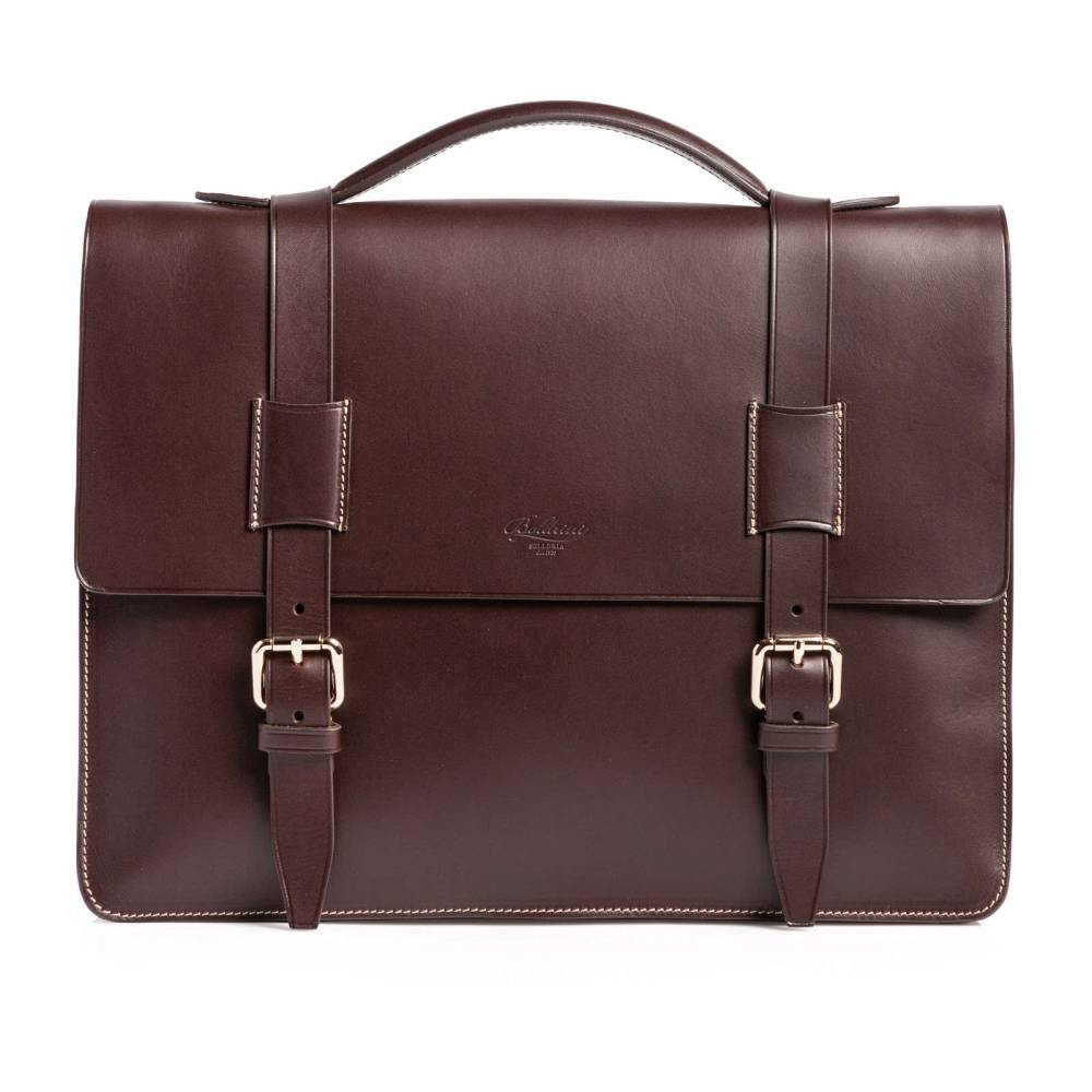 Мужской классический портфель Boldrini Selleria выполнен из гладкой натуральной кожи тёмно-коричневого цвета с контрастной отстрочкой. Клапан модели застёгивается на регулируемые ремни с металлическими пряжками. Внутри два отделения, разделённые плоской стенкой на молнии, карманы для паспортов, визиток, канцелярских принадлежностей и мобильного телефона. С внешней стороны расположен карман для документов A4 на молнии. В комплекте отстёгивающийся текстильный плечевой ремень, регулируемый по длине. Клапан декорирован тиснением в виде логотипа бренда.