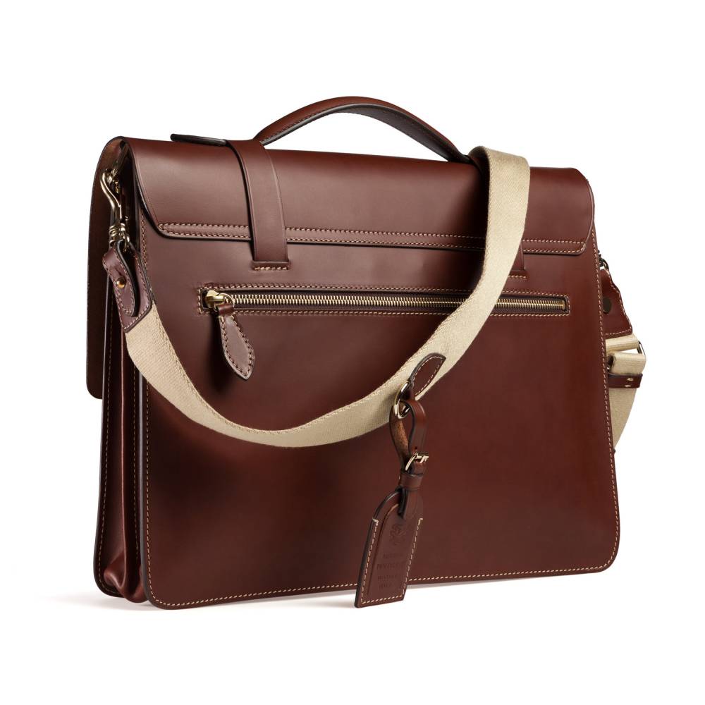 Мужской классический портфель Boldrini Selleria выполнен из гладкой натуральной кожи коричневого цвета с контрастной отстрочкой. Клапан модели застёгивается на регулируемые ремни с металлическими пряжками. Внутри два отделения, разделённые плоской стенкой на молнии, карманы для паспортов, визиток, канцелярских принадлежностей и мобильного телефона. С внешней стороны расположен карман для документов A4 на молнии. В комплекте отстёгивающийся текстильный плечевой ремень, регулируемый по длине. Клапан декорирован тиснением в виде логотипа бренда.