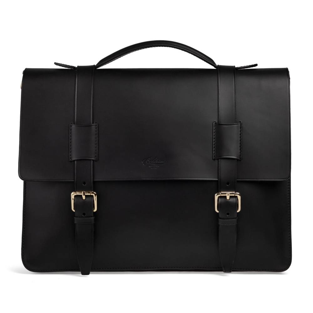 Мужской классический портфель Boldrini Selleria выполнен из гладкой натуральной кожи чёрного цвета. Клапан модели застёгивается на регулируемые ремни с металлическими пряжками. Внутри два отделения, разделённые плоской стенкой на молнии, карманы для паспортов, визиток, канцелярских принадлежностей и мобильного телефона. С внешней стороны расположен карман для документов A4 на молнии. В комплекте отстёгивающийся текстильный плечевой ремень, регулируемый по длине. Клапан декорирован тиснением в виде логотипа бренда.