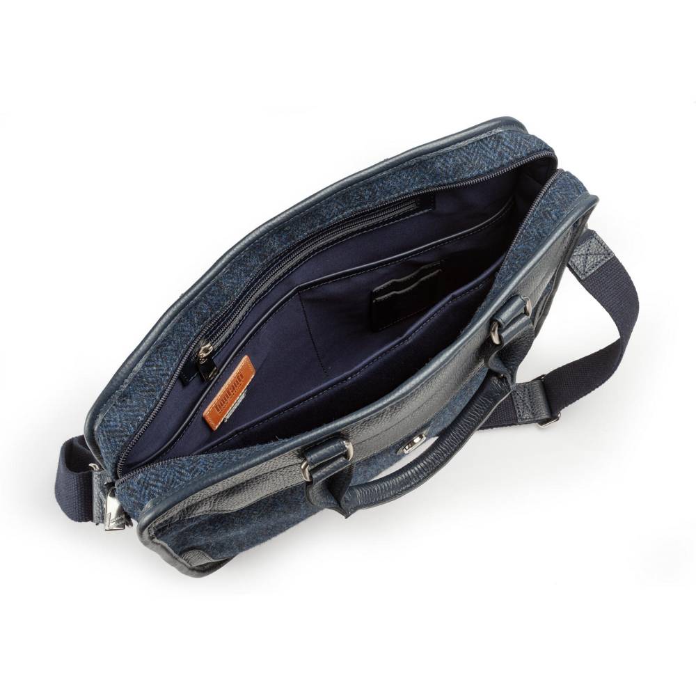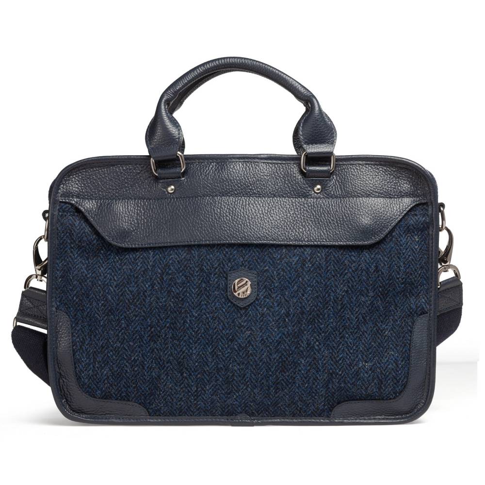 Компактный тёмно-синий брифкейс итальянской марки Bonfanti для деловых будней. С внешней стороны знаменитая шотландская шерсть Harris Tweed. Ручки и отделка из натуральной телячьей кожи с зернистой фактурой. Подкладка выполнена из приятной на ощупь хлопковой ткани. Брифкейс вмещает в себя ноутбук 14 дюймов. Внутри карман на молнии для ценных вещей, а также карманы для документов, карточек, визиток, ключей и других мелочей. Основное отделение и два дополнительных внешних отделения застегиваются на молнии. К брифкейсу прилагается широкий плечевой ремень из плотного канваса.