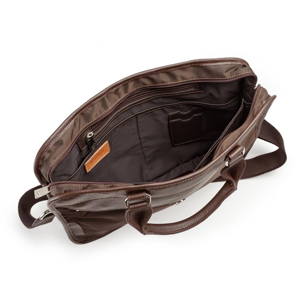 Компактный тёмно-коричневой брифкейс итальянской марки Bonfanti для деловых будней. С внешней стороны плотный гладкий нейлон, а также ручки и отделка из натуральной телячьей кожи с зернистой фактурой. Подкладка выполнена из полиэстера, имитирующего хлопок. Брифкейс вмещает в себя ноутбук 14 дюймов. Внутри карман на молнии для ценных вещей, а также карманы для документов, карточек, визиток, ключей и других мелочей. Основное отделение и два дополнительных внешних отделения застёгиваются на молнии. К брифкейсу прилагается широкий плечевой ремень из плотного полиэстера.