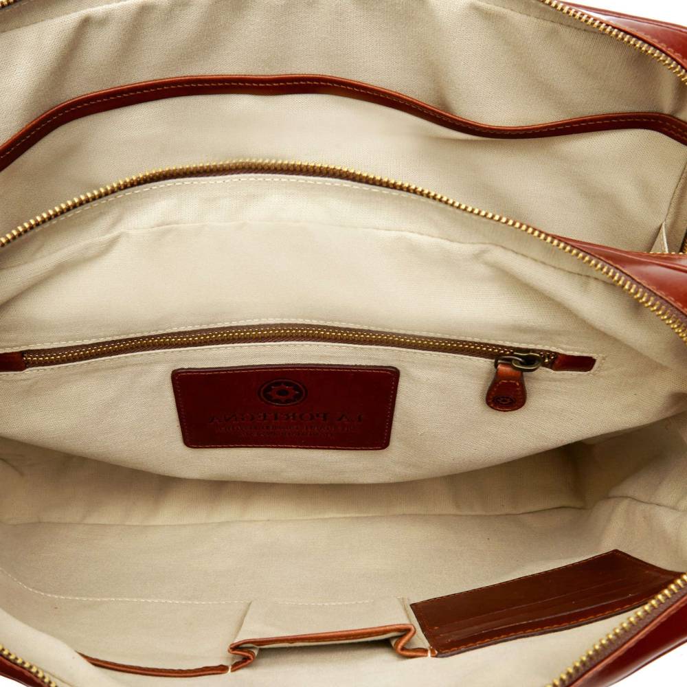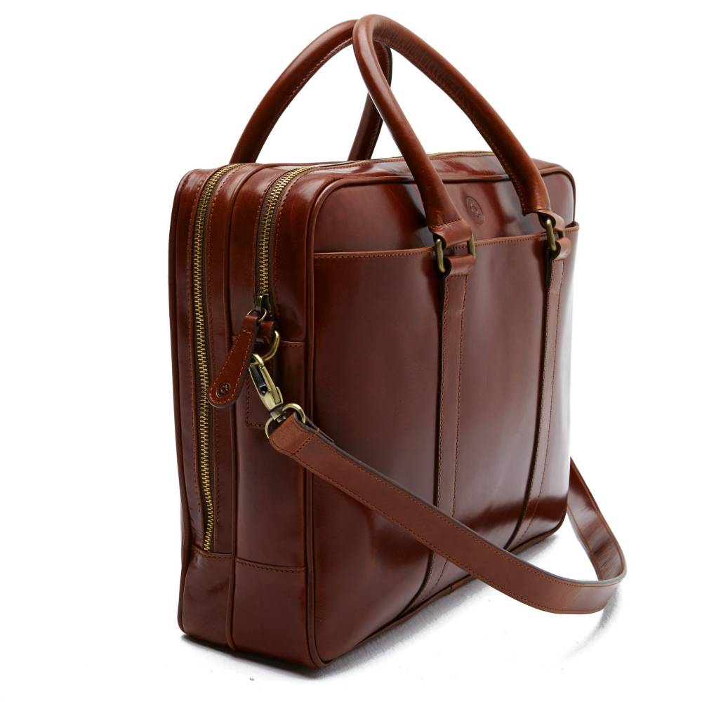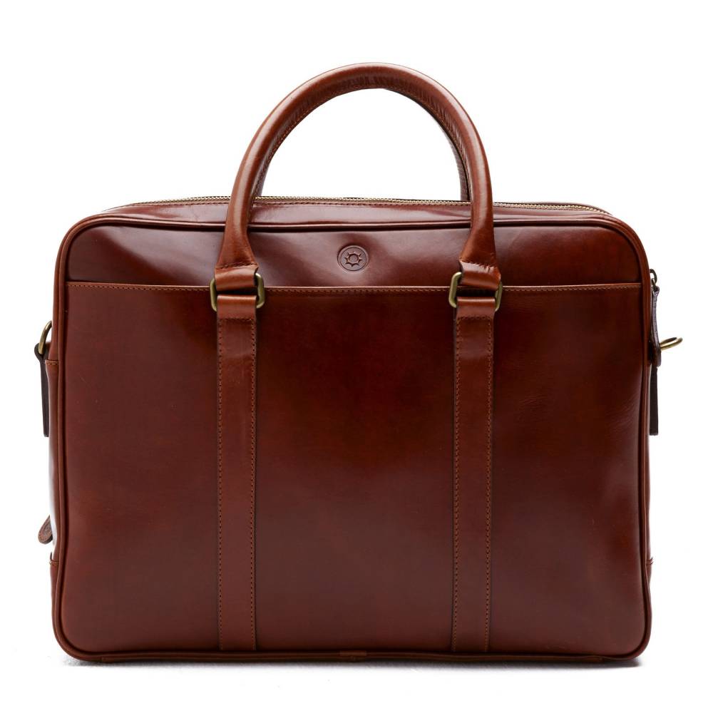 Портфель выполнен из плотной приятной на ощупь кожи растительного дубления. В производстве данной кожи использовались дубительные вещества растительного происхождения и оливковые масла, которые сделали её мягкой и эластичной, сохранив естественный цвет. Со временем такая кожа приобретает благородную патину и красиво стареет.
