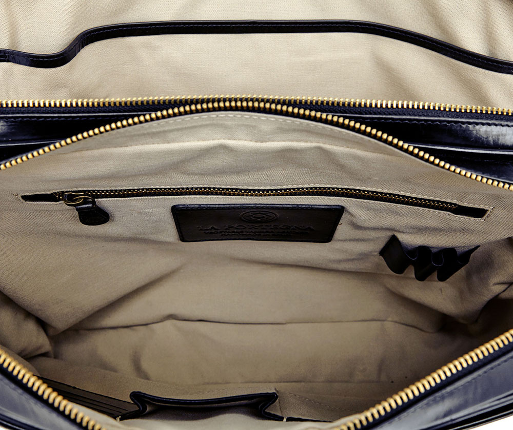 Вместительный мужской портфель Fat Carter тёмно-синего цвета из коллекции испанского бреда La Portegna. Модель имеет два вместительных отделения на молниях, в одно из которых вмещается ноутбук с диагональю 17". Внутри несколько кожаных карманов для банковских карт и ручек, карман для телефона, а также отделение на молнии. Подкладка из мягкого канваса бежевого цвета. С внешней стороны имеется плоское отделение на магнитной кнопке для документов. К портфелю прилагается регулируемый плечевой ремень.